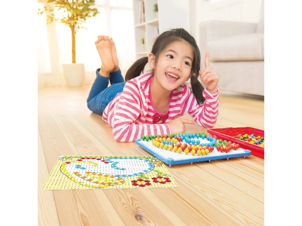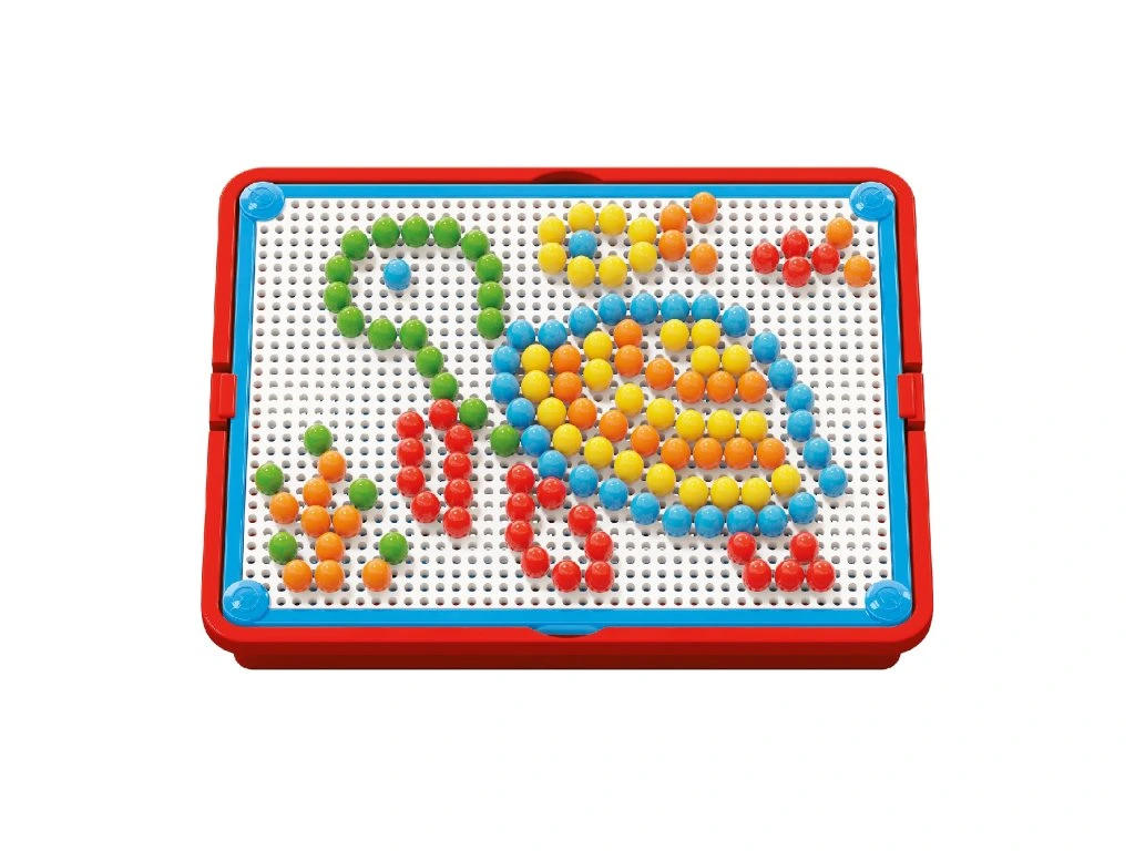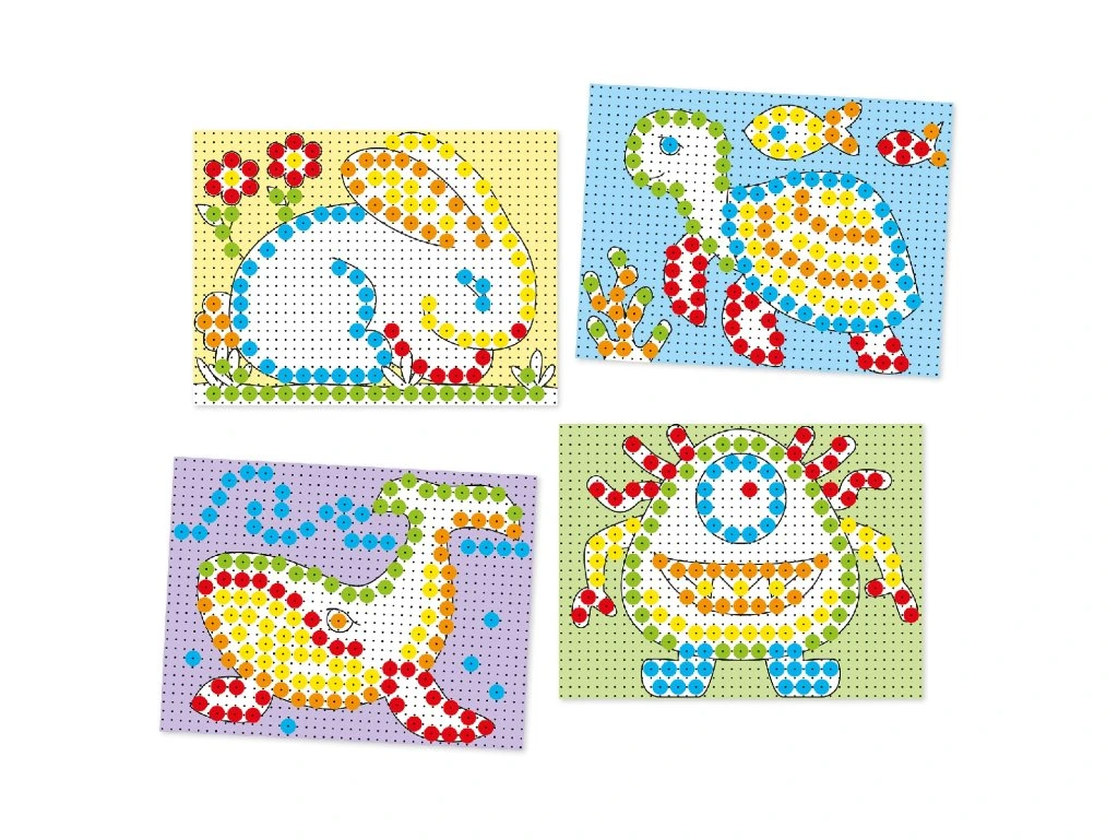 Mozaiky u dětí rozvíjejí jemnou motoriku, tvořivost a fantazii. Sada obsahuje kufřík, děrovanou hrací desku a barevné kolíčky s hlavičkami 5 různých barev a průměru 10 mm. Pomocí kolíčků zasazených do otvorů v hrací desce mohou děti tvořit různé obrázky nebo vzory.