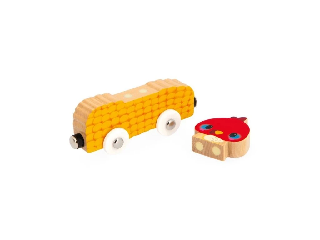 Zvířata žijící na louce i ve stáji milují závody! Magnetická hračka obsahuje 3 auta – lilek, kukuřici a polní květy – a 3 dřevěné postavičky – slepici, morče a krávu. Dítě může spárovat každé zvířátko s jeho oblíbeným jídlem nebo je posadit do auta podle vlastního výběru – všechny prvky jsou zaměnitelné.