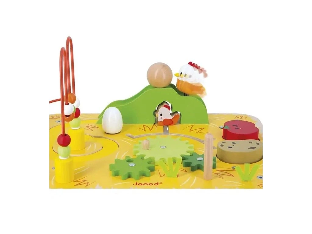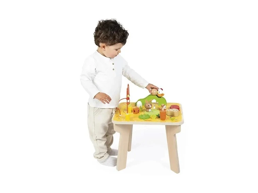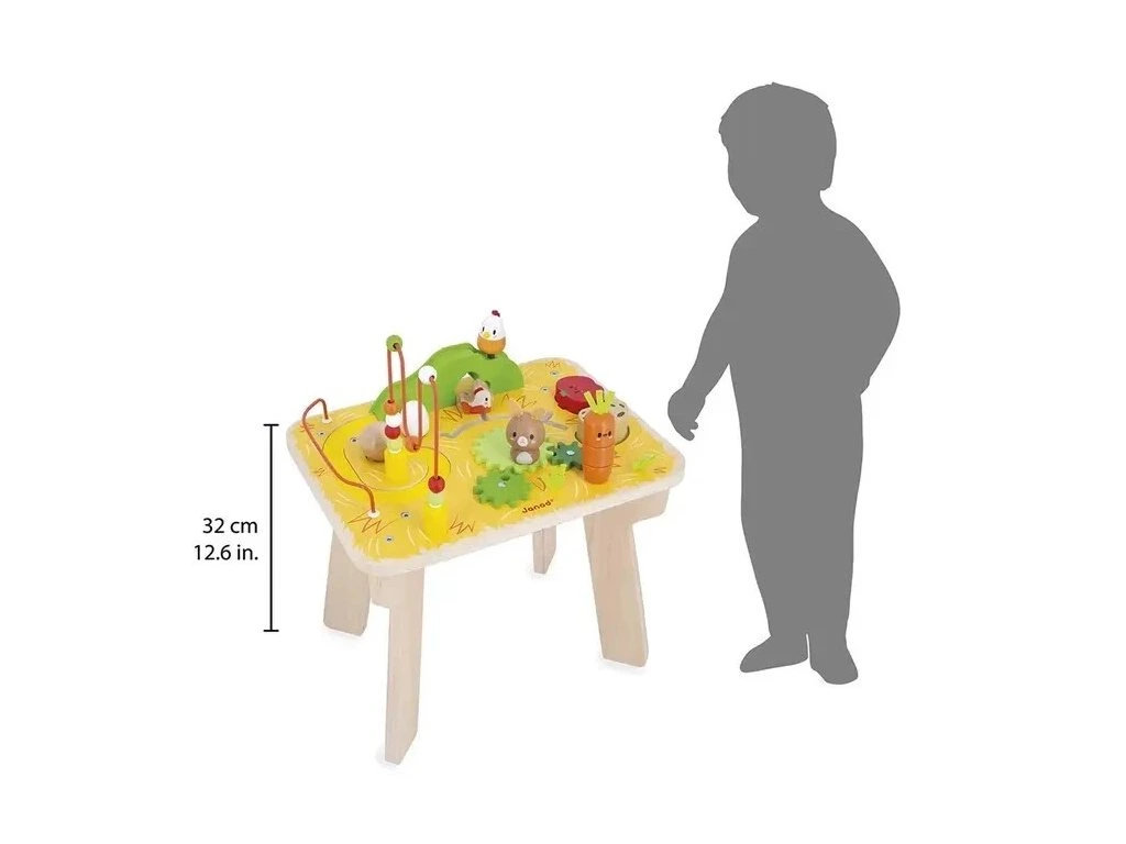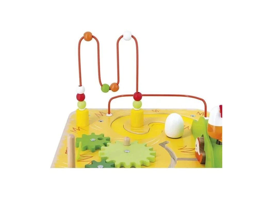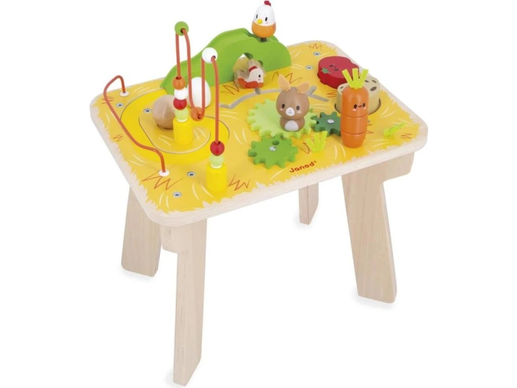 - 1 dřevěný stolek se 7 aktivitami: pružinové kuřátko, okruh s kuličkami, 3 převody s králíčkem, stohovatelná mrkev, brambora a rajče, běžící labyrint