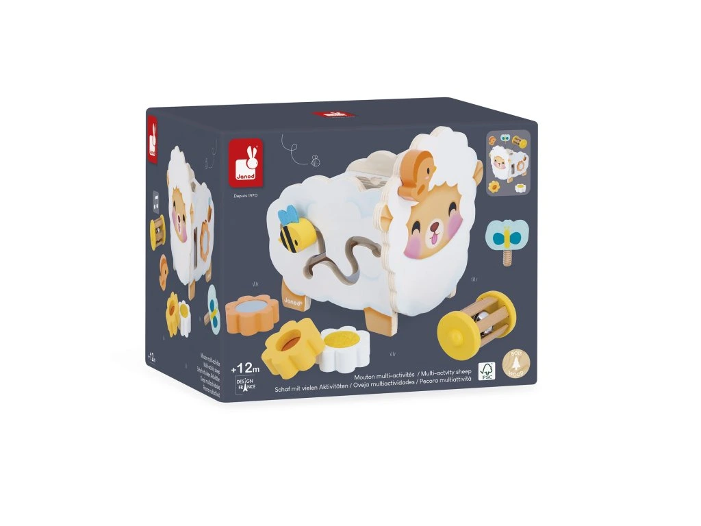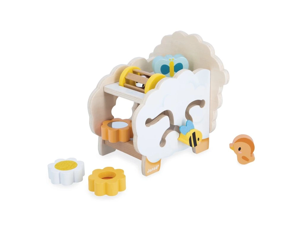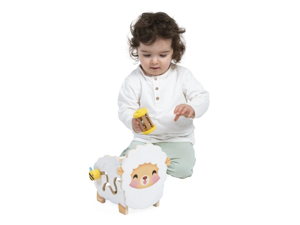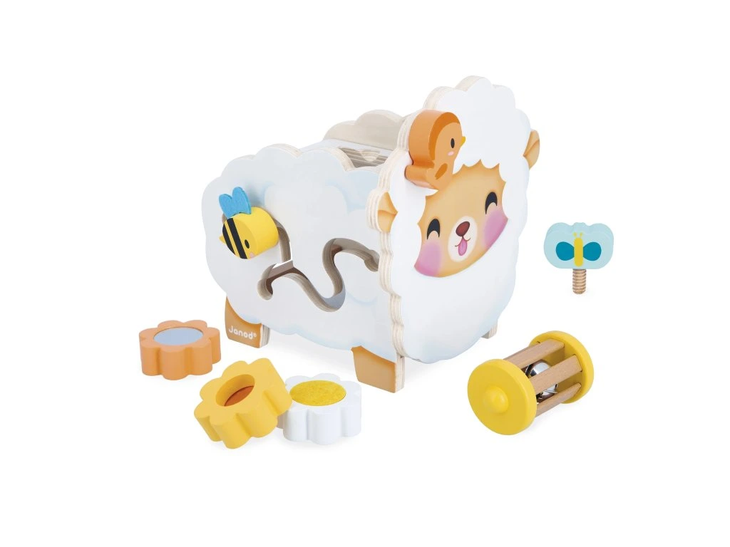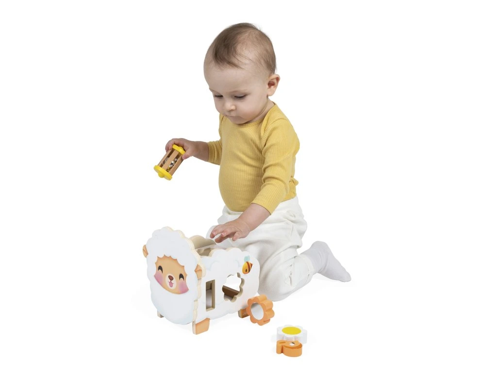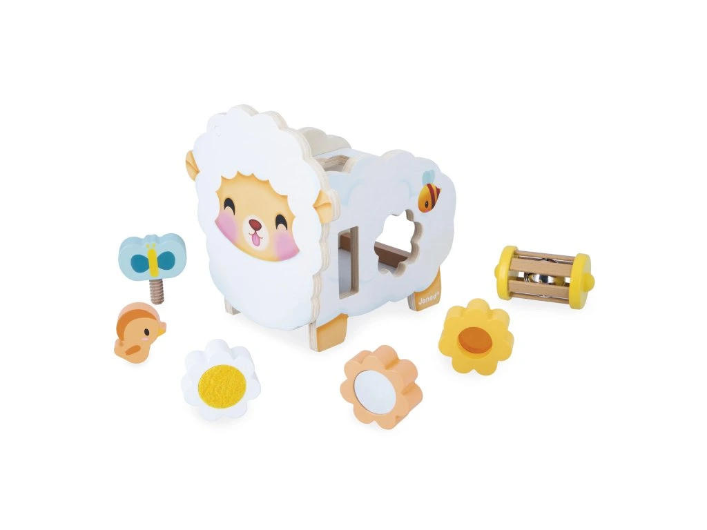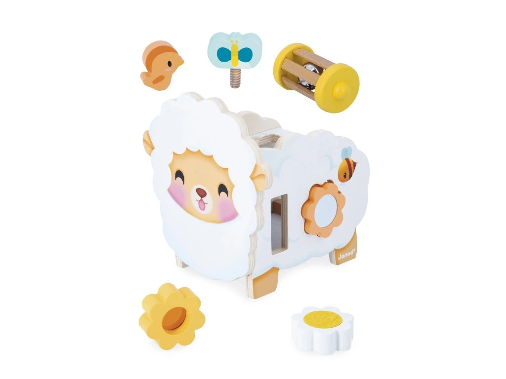 Představujeme velmi roztomilou ovečku Janod! Tato interaktivní dřevěná hračka pro děti od 12 měsíců obsahuje 6 doplňků, které se dají umístit na ovečku nebo do ní, což podporuje rozvoj jemné motoriky a představivosti.