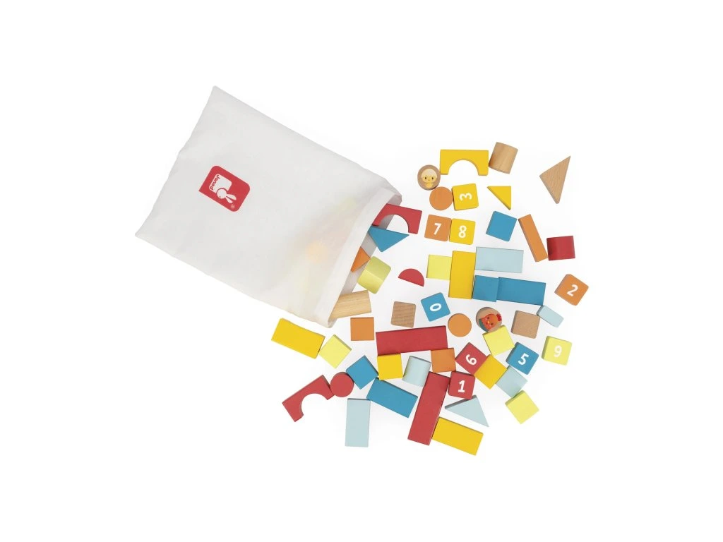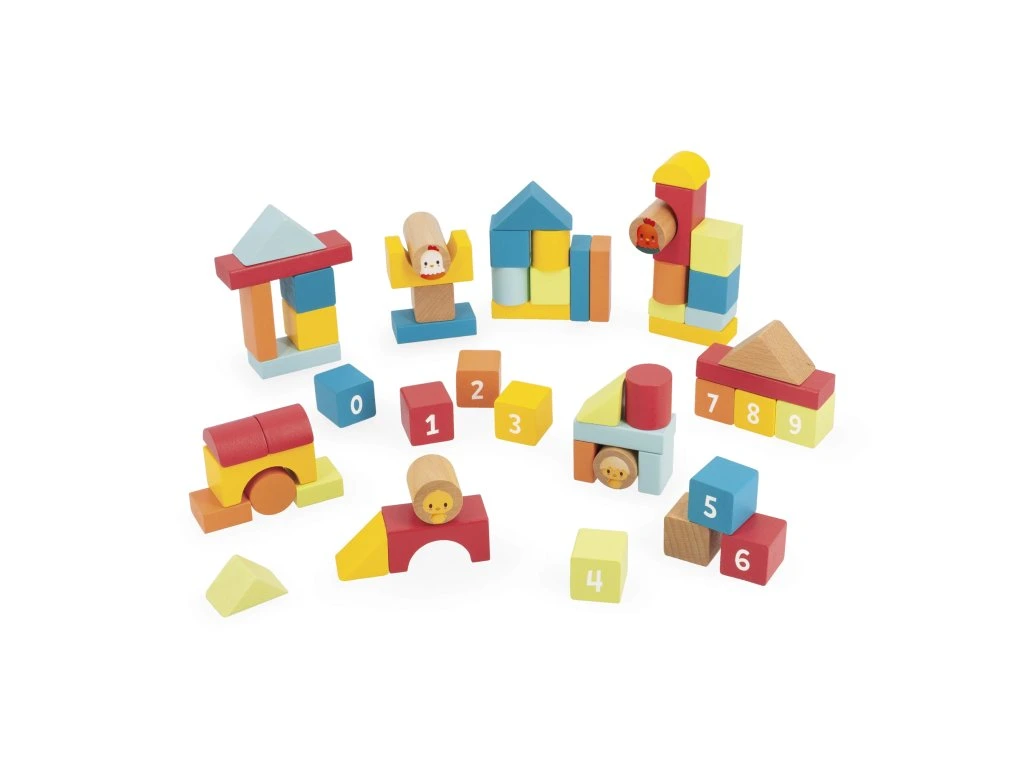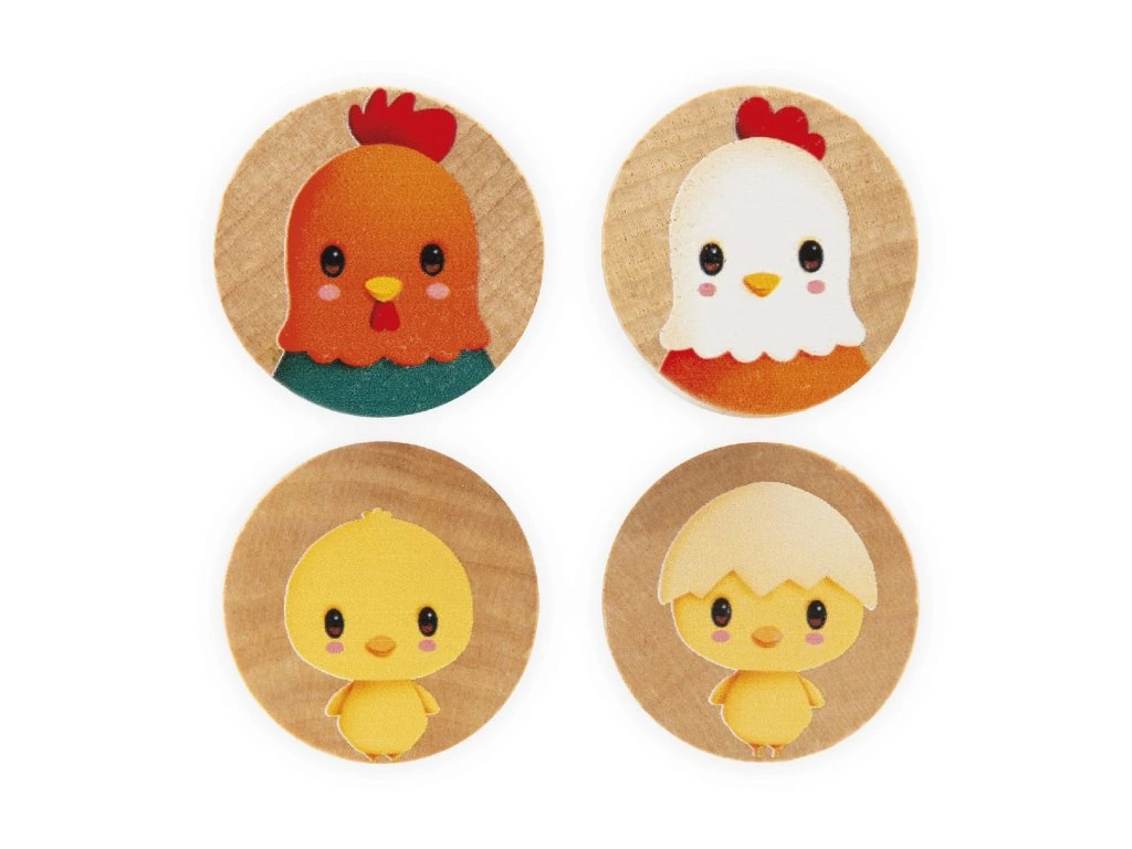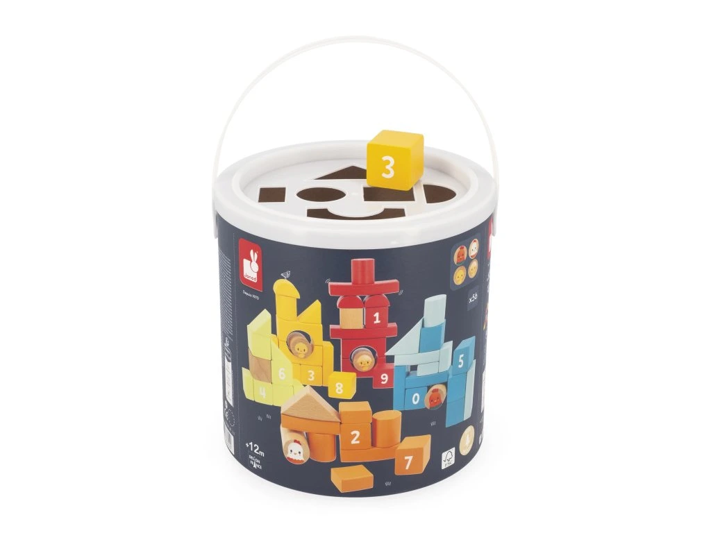Víčko kyblíčku má otvory na jednotlivé dílky, takže se může používat jako třídička tvarů pro jednoduché uklízení. Dílky obsahují kruhy, čtverce a trojúhelníky, stejně jako mosty a ilustrace (slepička, kohout a kuřátka), které podněcují kreativitu dítěte.