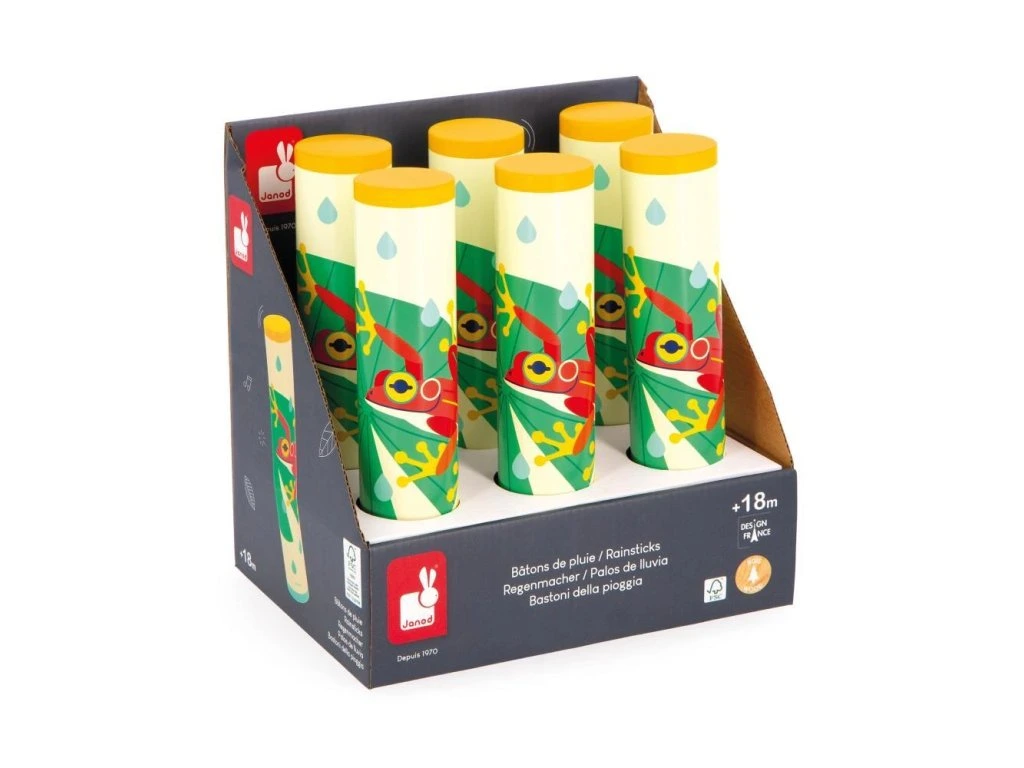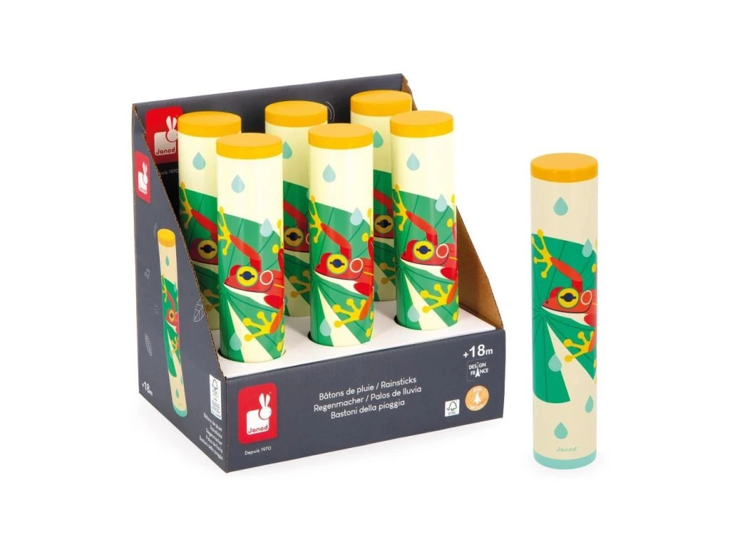 Představte si, že sedíte se svým dítětem u jezírka a relaxujete při zvuku deštivé hůlky Janod. Stačí ji převrátit a dítě může poslouchat jemný zvuk znovu a znovu, což probouzí smysly a stimuluje hudební objevování.