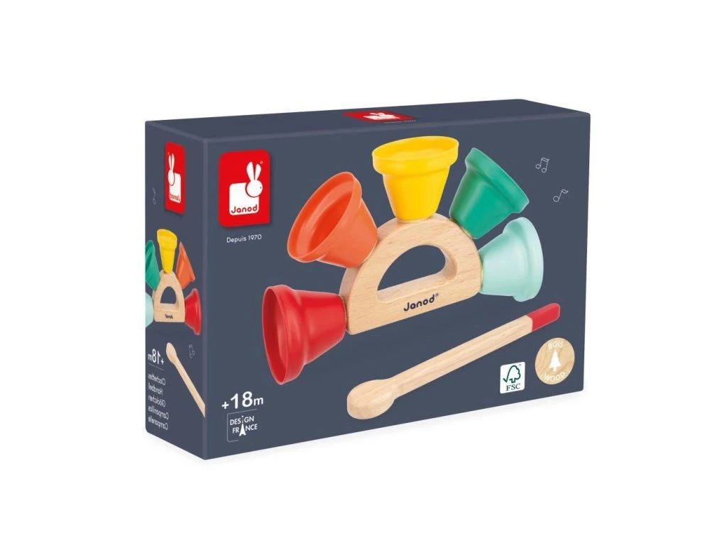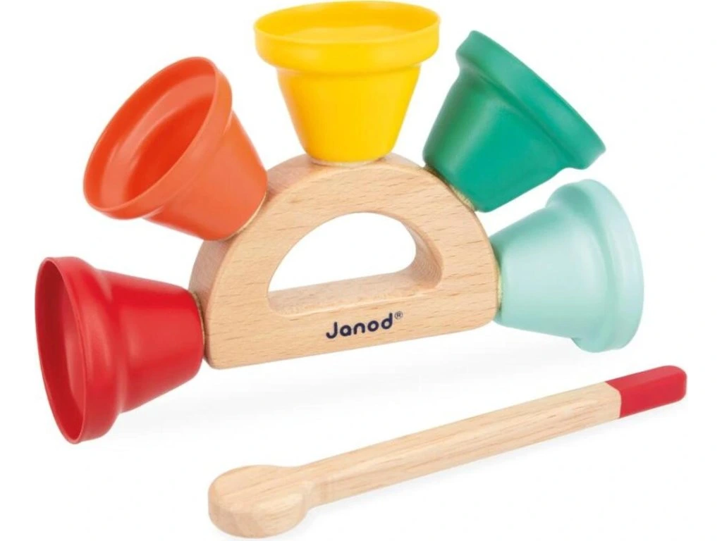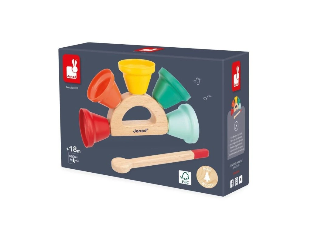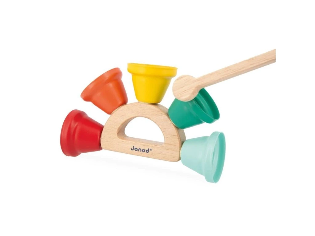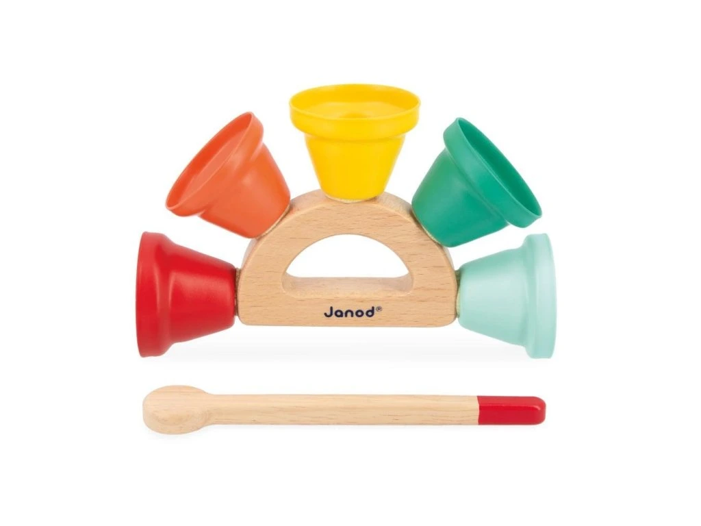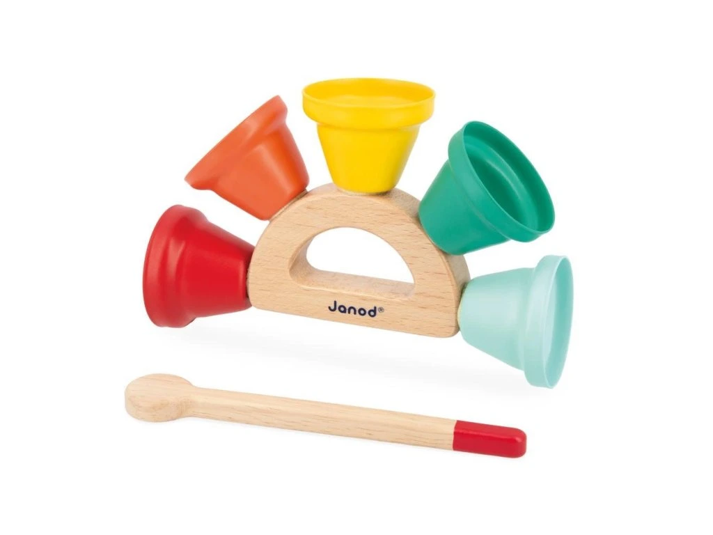 Radost pro vaše uši! Tato hudební hračka je ideální pro děti od 18 měsíců a nabízí 5 kovových zvonečků připevněných k dřevěné rukojeti s paličkou na zvonění. Dítě může objevovat různé tóny, rozvíjet hudební povědomí a koordinaci pohybů při zábavě se zvonečky.