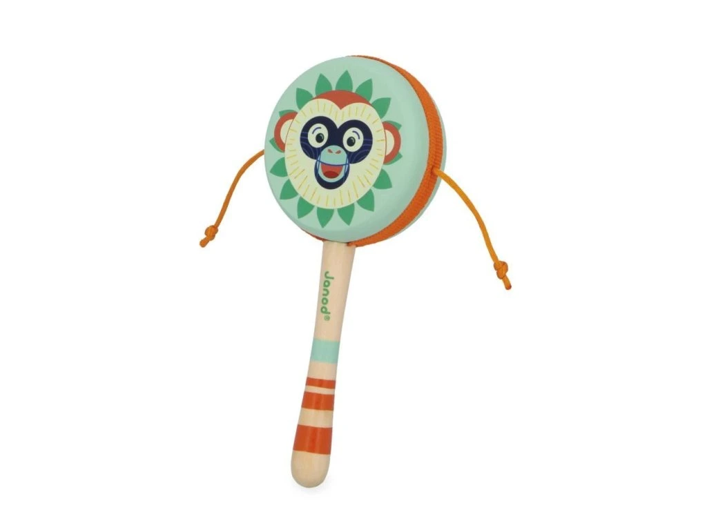 Tento ruční bubon ve tvaru opice je ideální pro děti od 2 let. Stačí vložit rukojeť mezi ruce a otáčet tam a zpět – rychleji nebo pomaleji podle požadovaného rytmu. Bubon je skvělou pomůckou pro seznámení dětí s hudbou, rozvoj smyslu pro rytmus a koordinaci pohybů.