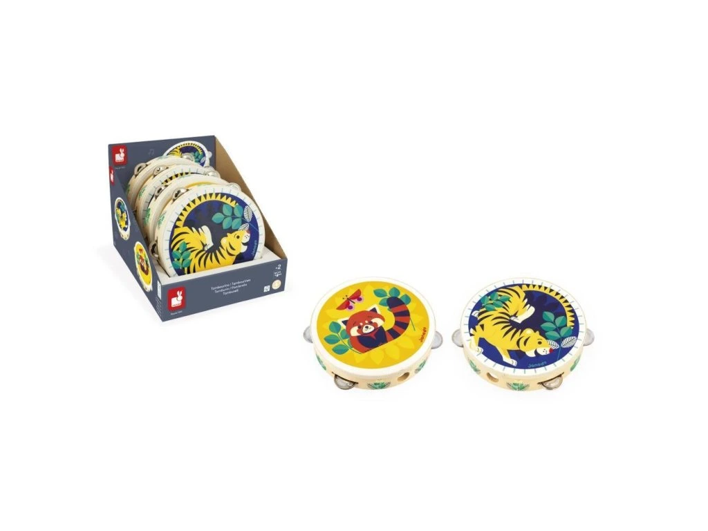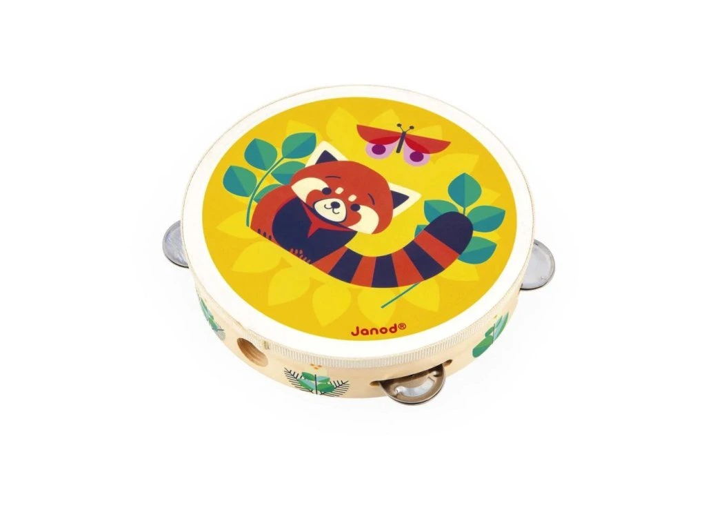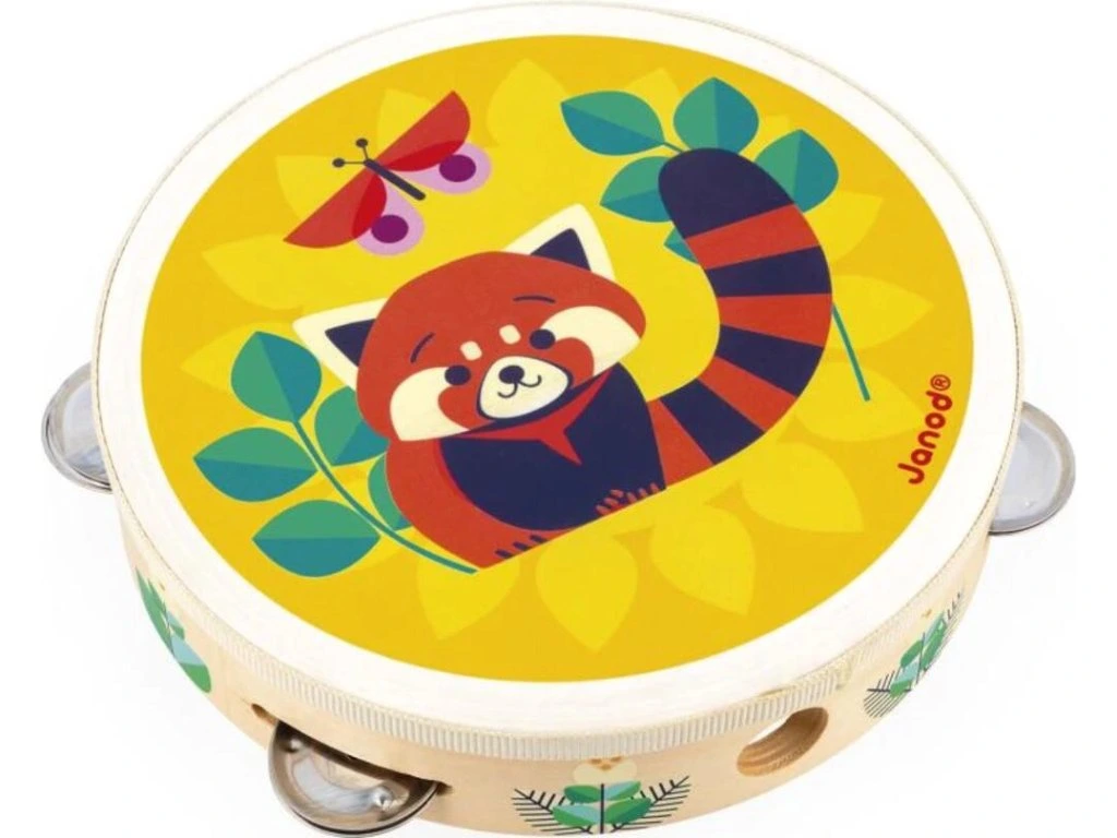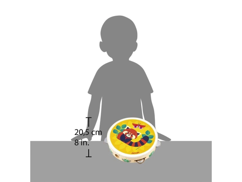 Tamburína je vyrobena ze dřeva s certifikací FSC™ a barvy jsou na vodní bázi. Rozměry: 20,5 × 20,5 × 4,5 cm. Materiál: dřevo a kov.