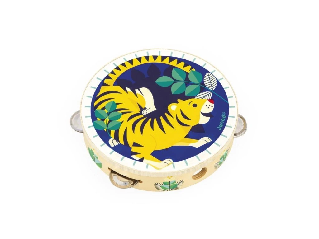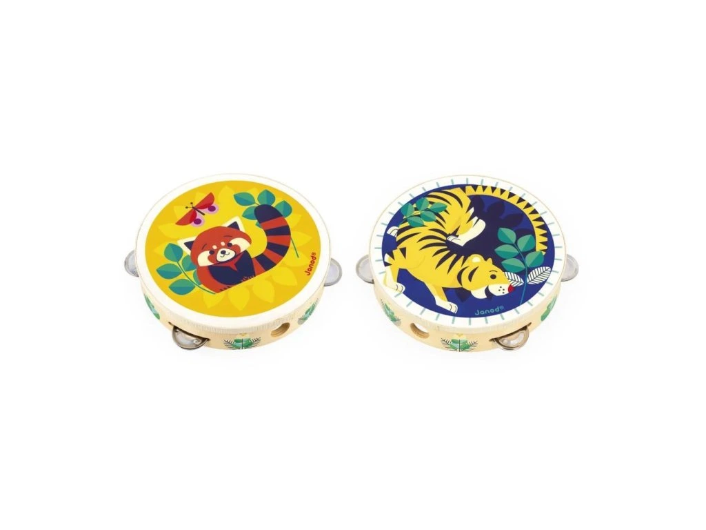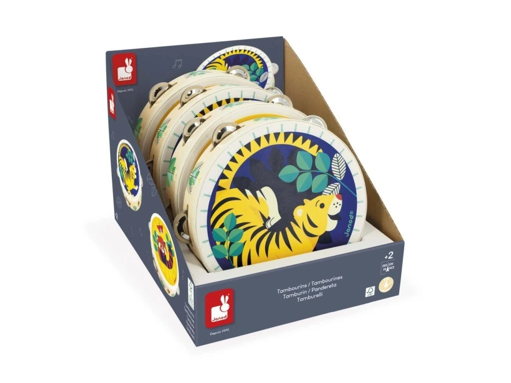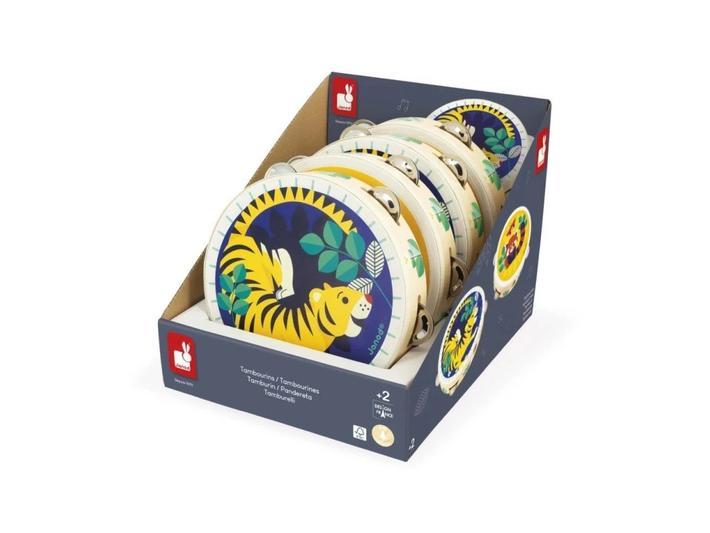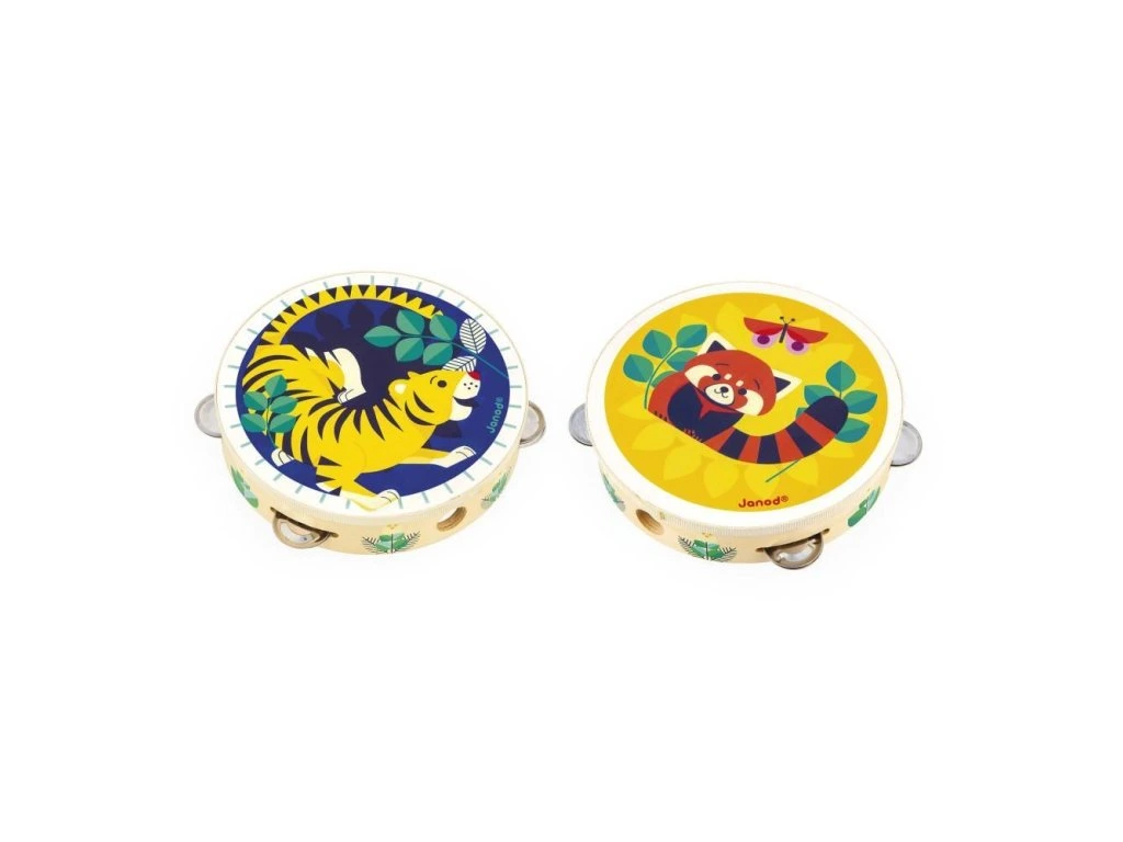 Tamburína je vyrobena ze dřeva s certifikací FSC™ a barvy jsou na vodní bázi. Rozměry: 20,5 × 20,5 × 4,5 cm. Materiál: dřevo a kov.