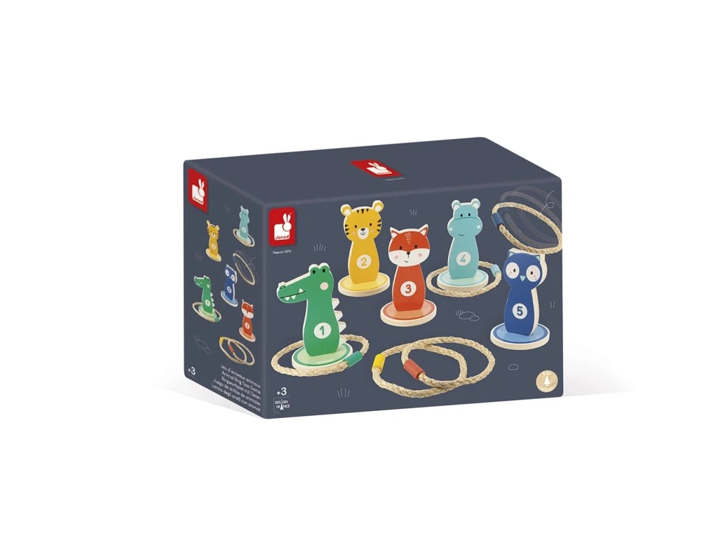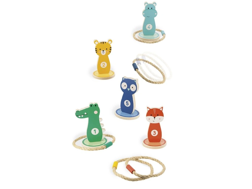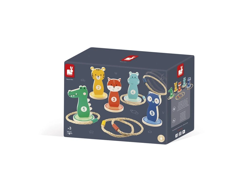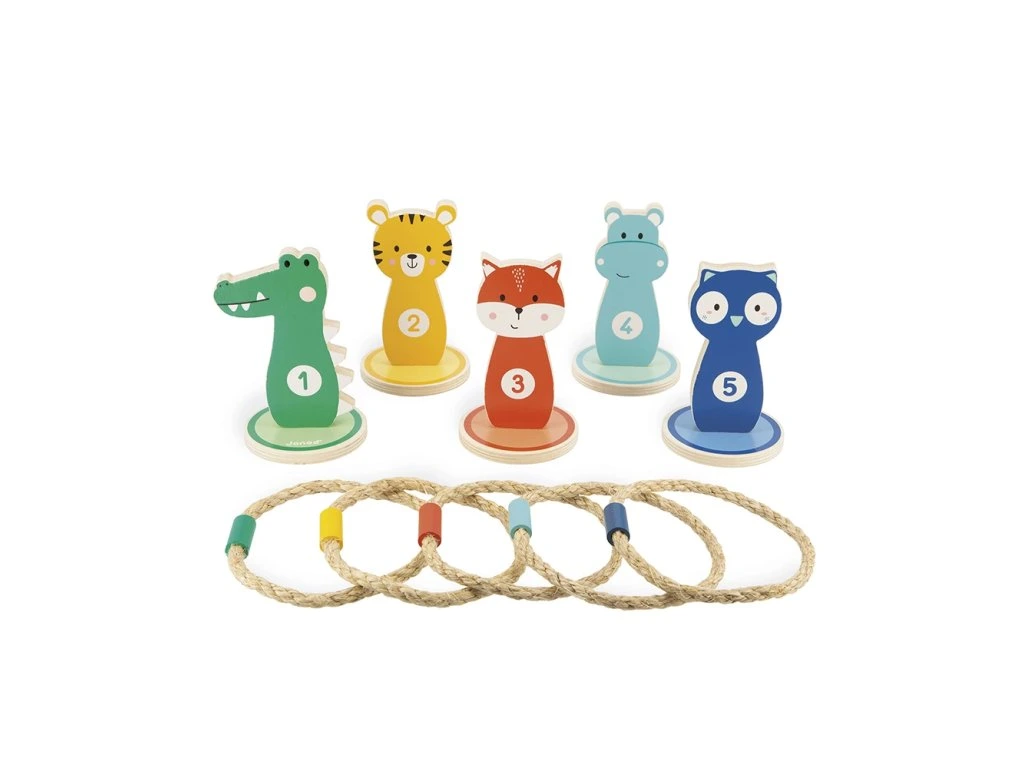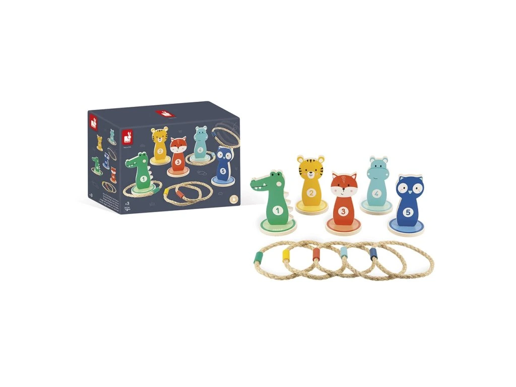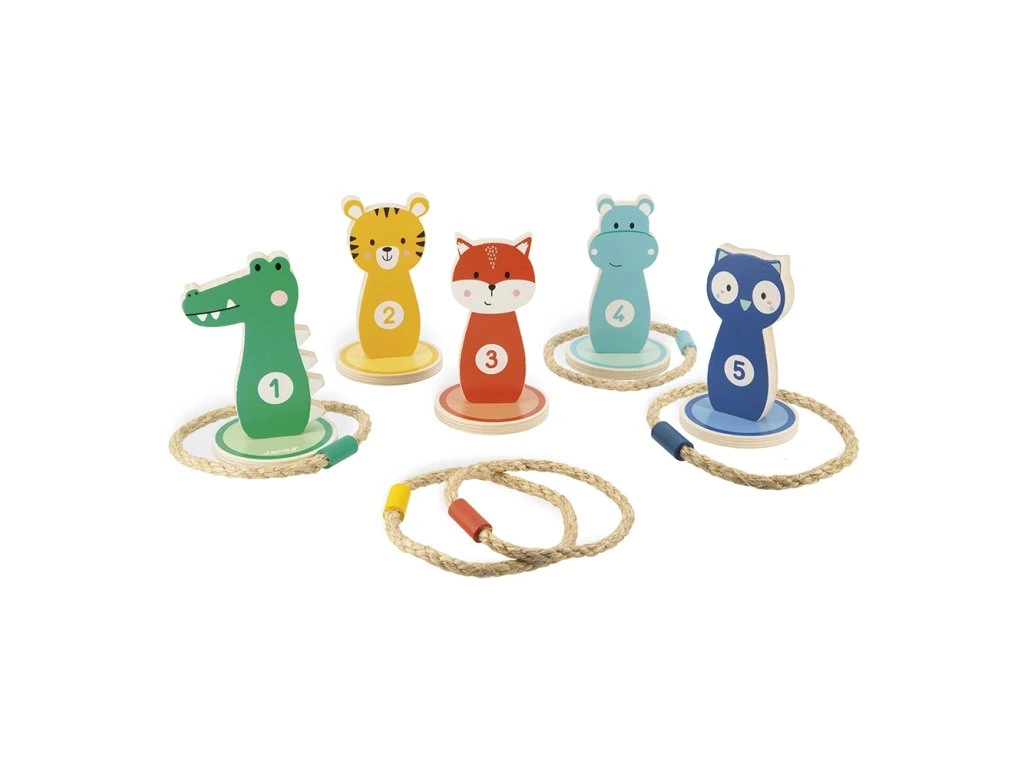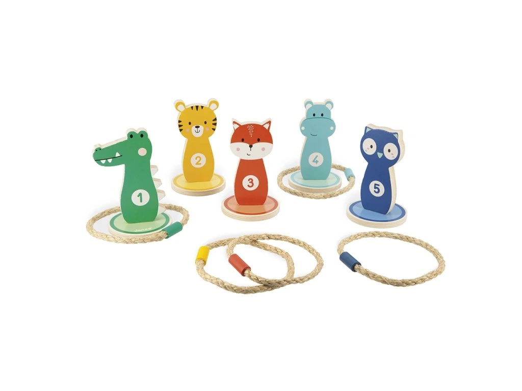 Výborná hra na narozeninové oslavy, která zažene nudu, rozhýbe děti a hráči si procvičí odhad vzdálenosti a přesnost. Zábavná klasika mezi pohybovými hrami - dřevěné terče na házení kruhů, s milým designem barevných zvířátek. Cílem hry je hodit všechny kruhy na kolíky a získat nejvíce bodů. Hra je náročnější, když se hází z větší vzdálenosti. Kruhy jsou lanové, s dřevěným závažím, terčů a kruhů je 5 ks.