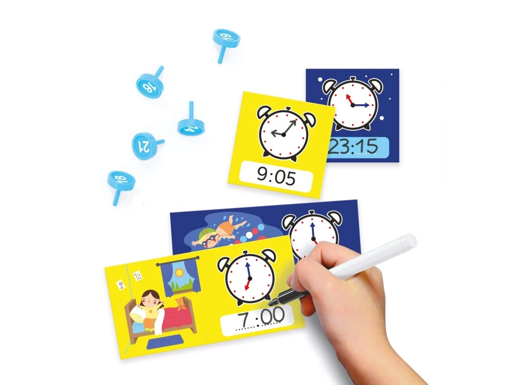 Primo Clock je kreativní a vzdělávací hračka, která dětem pomáhá naučit se určovat čas hravou formou. Děti si mohou sestavit vlastní hodiny na hraní a naučit se principy určování času pomocí barevně rozlišených minutových a hodinových ručiček, kterými je možné manuálně pohybovat.Po sestavení hodin si děti mohou procvičovat určování času pomocí přiložených 18 oboustranných karet a smazatelného fixu. Tato hračka je ideální na rozvoj jemné motoriky, kognitivních schopností a pochopení základů časového konceptu.