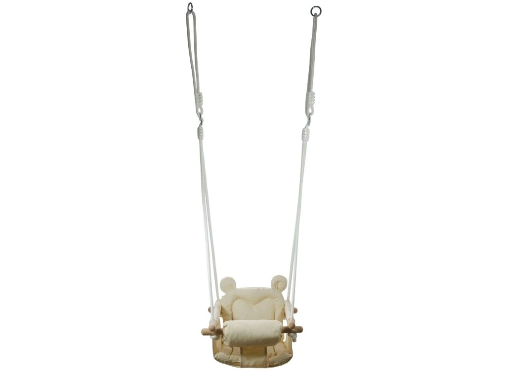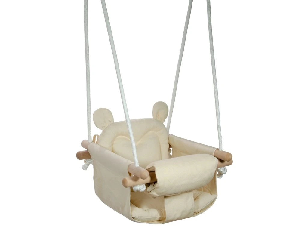 Kombinace konstrukce z bukového dřeva a sedátka ze 100 % bavlny zaručuje pohodlí i bezpečnost při houpání. Lano se dvěma karabinami je výškově nastavitelné, takže se přizpůsobí prostoru i dítěti.