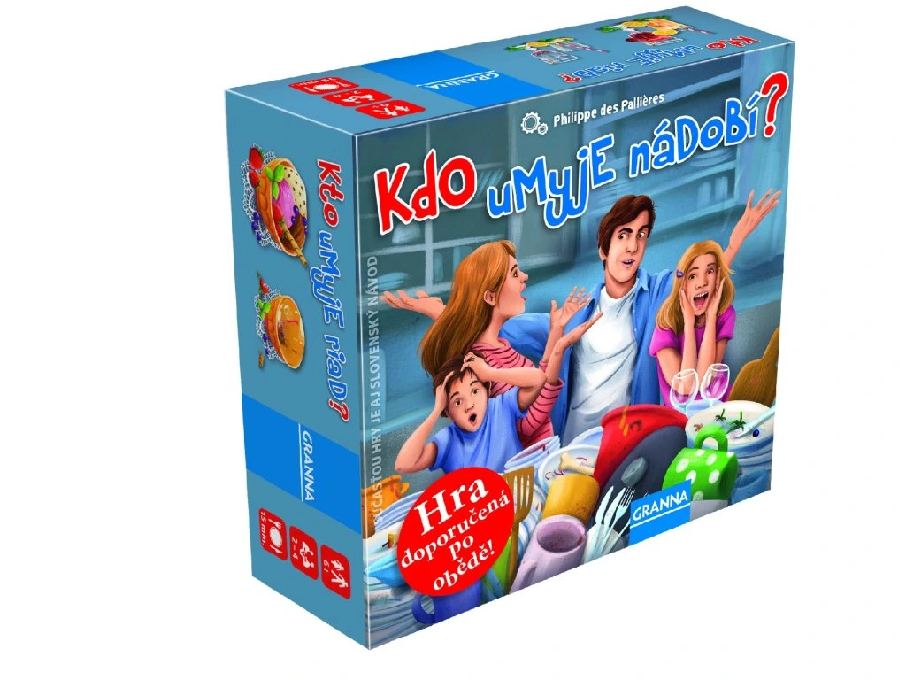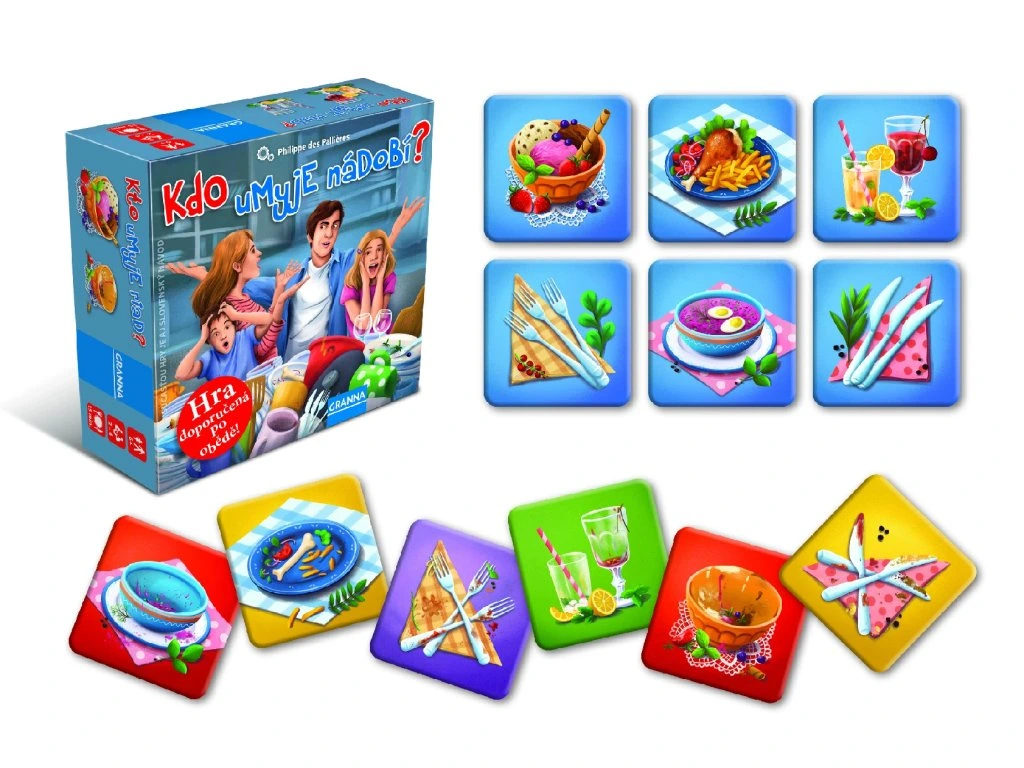 Kdo umyje nádobí? je svižná hra, která kombinuje postřeh, rychlé reakce a soustředění. Na začátku má každý hráč před sebou kartičky rozmístěné v daném pořadí, otočené „čistou" stranou nahoru. V každém tahu si mohou hráči vybrat, zda otočí kteroukoliv kartičku na „špinavou" stranu, nebo se zbaví už otočené „špinavé" kartičky tak, že ji položí na jinou „špinavou" kartu stejné barvy nebo druhu. Vítězem se stává ten, kdo se nejrychleji zbaví všech „špinavých" kartiček, čím si zároveň „splní povinnost po obědě"!Obsah balení: