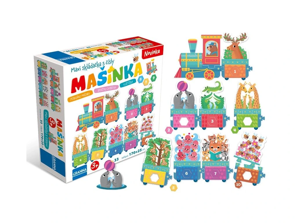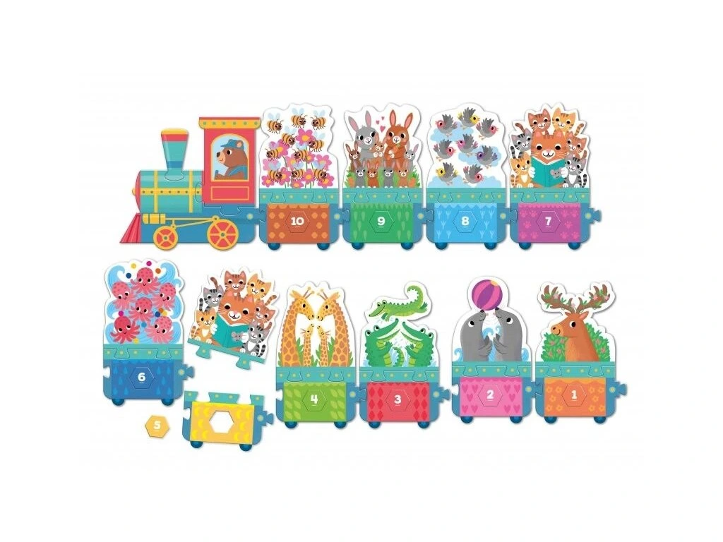 Jak si hrát: Sestavte mašinku, spočítejte zvířátka a přiřaďte správná čísla. Zkontrolujte, zda všechno sedí.