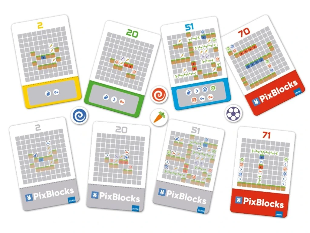 PixBlocks je logická hra, která učí základy programování zábavnou a přístupnou formou. Hráči řeší logické úlohy tak, že vytvářejí „programy" pro králíka, který se musí dostat k mrkevkám. Správně napsaný program, vytvořený kladením žetonů na hrací plochu podle zadání na kartě, umožní králíkovi najít všechny mrkevky. Pokud se to podaří, program byl správný!Tato hra pro 1 až 4 hráče ve věku od 7 let nabízí 56 úloh rozdělených do tří úrovní náročnosti, čímž rozvíjí logické myšlení a pomáhá budovat základy programátorského myšlení.