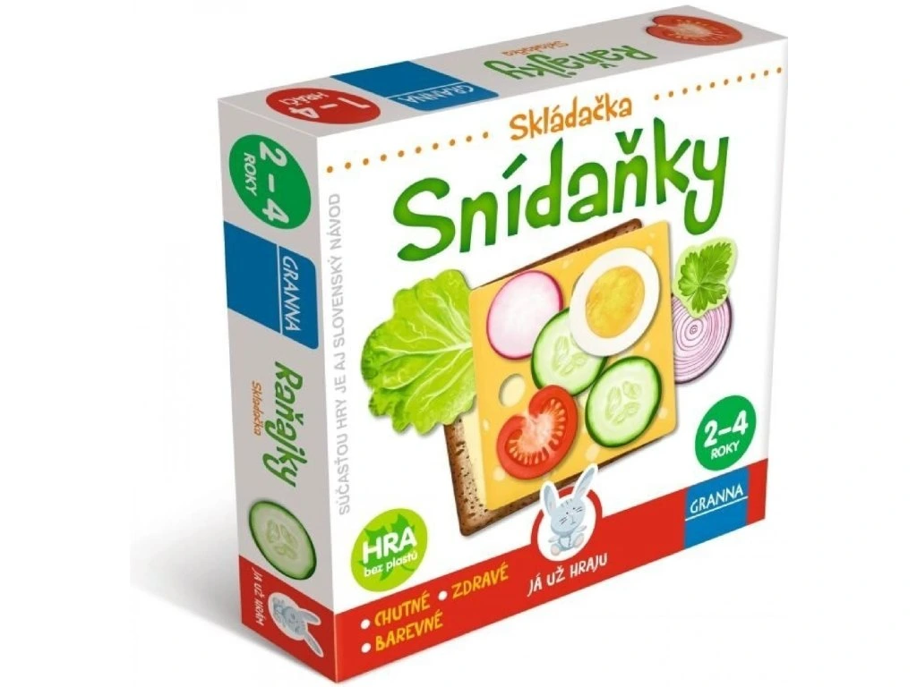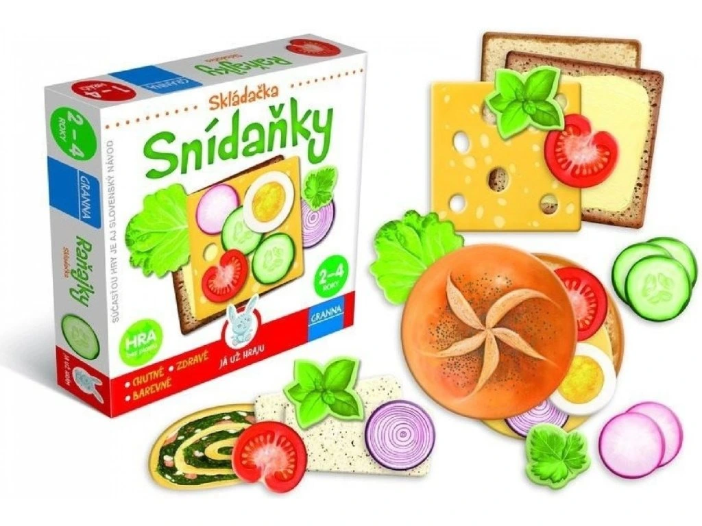 Ve hře Snídaně se děti učí vytvářet svůj první chlebíček s různými doplňky, přičemž se zároveň seznamují s názvy potravin a rozvíjejí svou kreativitu. Hra začíná výběrem oblíbeného pečiva a pěti různých doplňků, kterými si děti ozdobí svůj chlebíček. Hotový chlebíček mohou naservírovat na talířku, který najdou na dně krabičky.Tato hra podporuje učení názvů potravin a motivuje děti k samostatnému tvoření a experimentování s různými kombinacemi jídla.