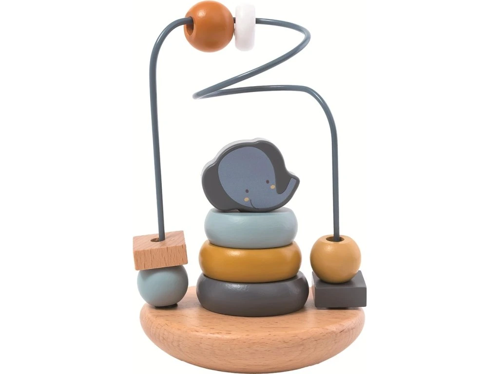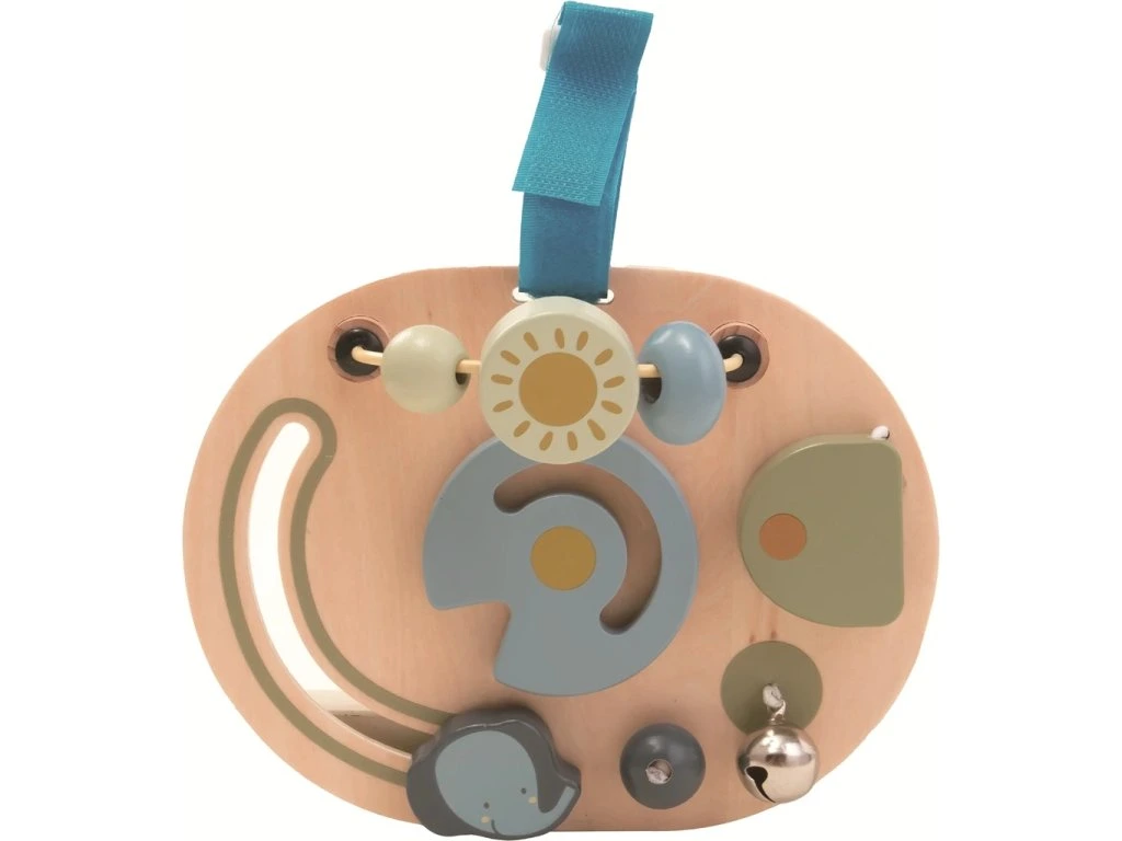Activity board obsahuje malý labyrint a různé posuvné, překlopné i otočné prvky. Barevné obloukové kostky se skládají podle velikosti, čímž si děti trénují logiku i trpělivost. Vkládací hra ve formě válce pomáhá rozpoznávat tvary a motorický labyrint s motivem slona rozvíjí úchop a přesnost pohybů.