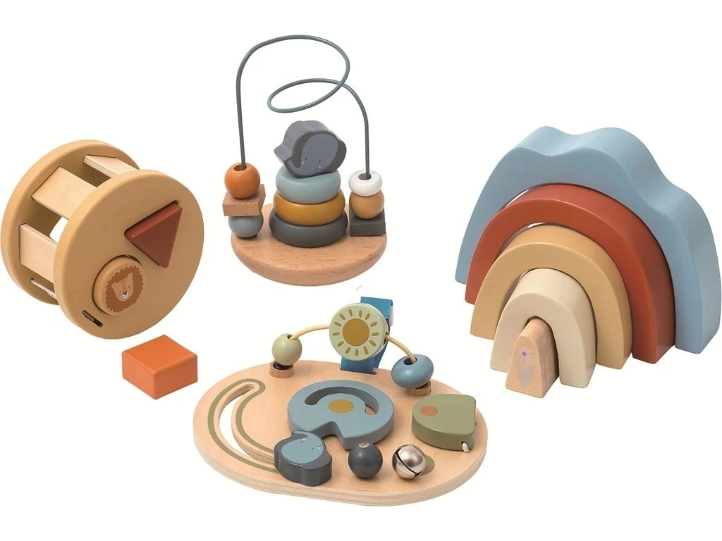 Sada 4 různorodých hraček pro děti od 1 roku nabízí spoustu zábavy, díky které si dítě přirozeně rozvíjí dovednost, zvědavost, jemnou motoriku a koordinaci oko-ruka.
