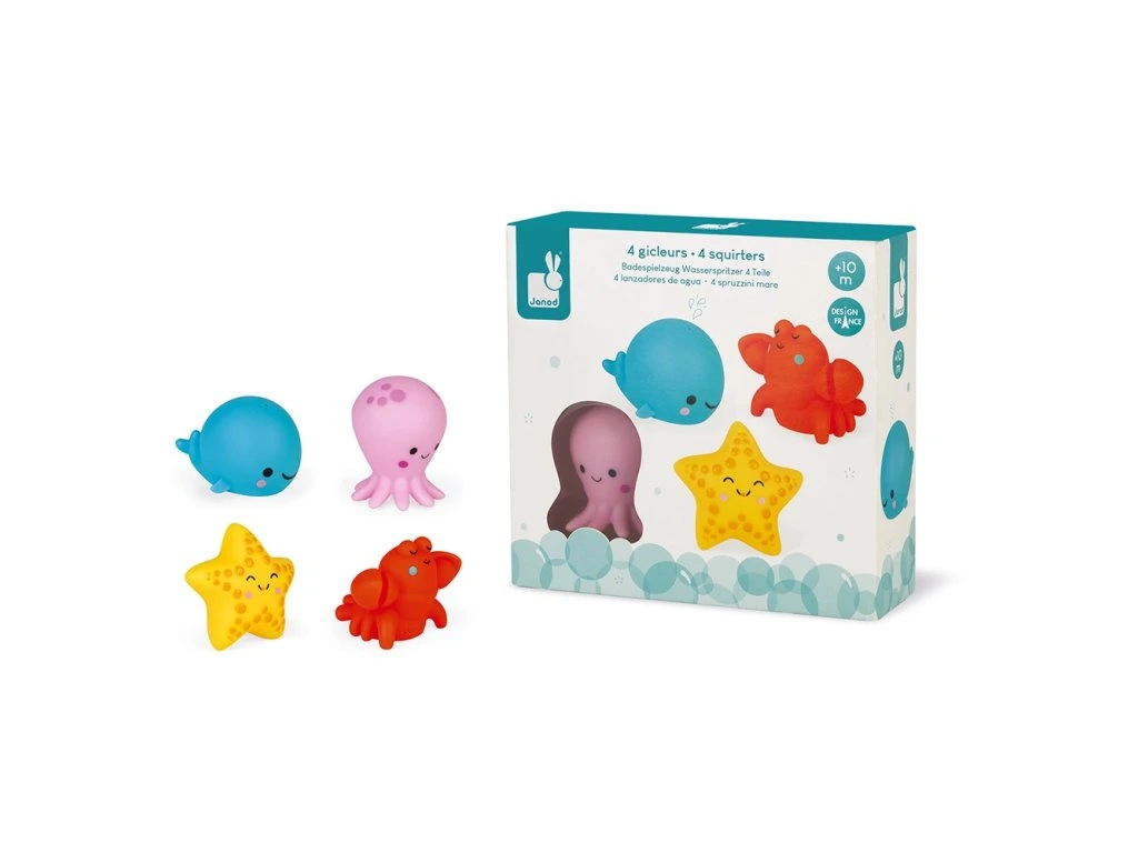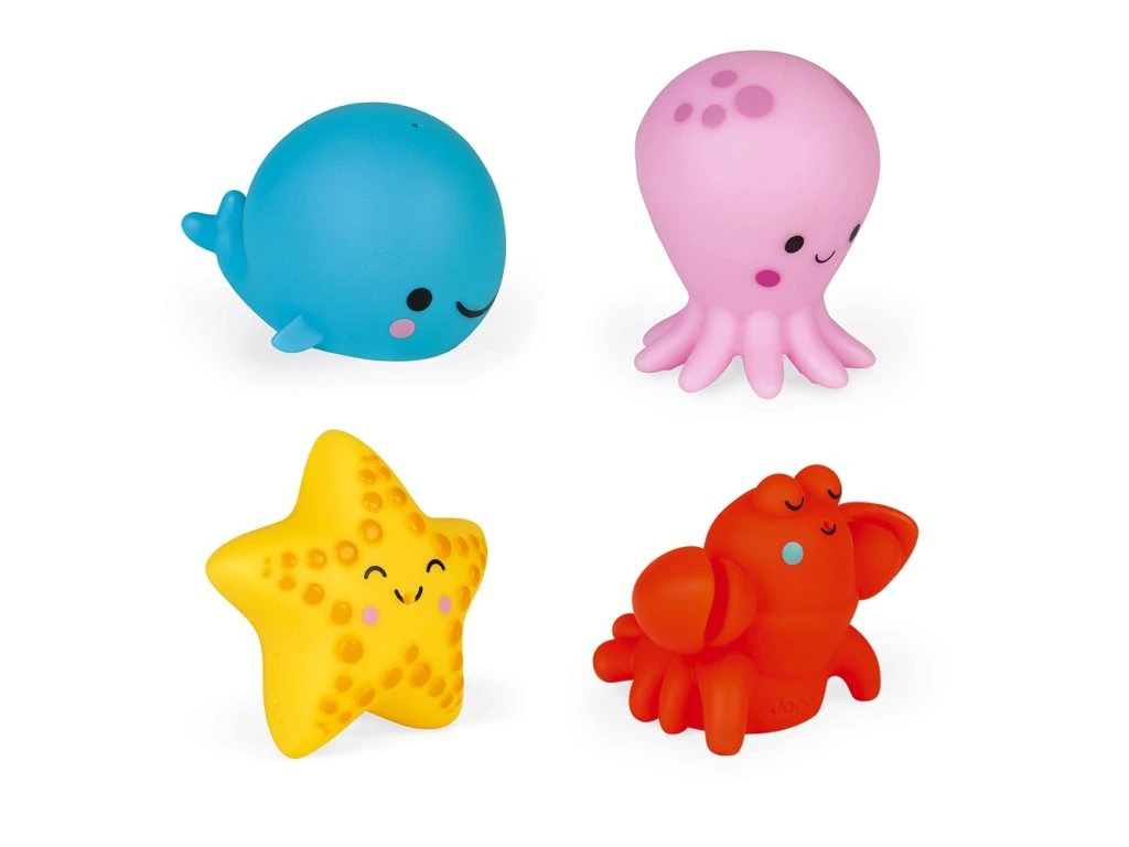 Stříkající hračka do vody Mořská zvířátka 4 ks Janod série Bath toys. Měkké plastové postavičky pro nejmenší, hračka je vhodná pro hru na suchu i ve vodě.