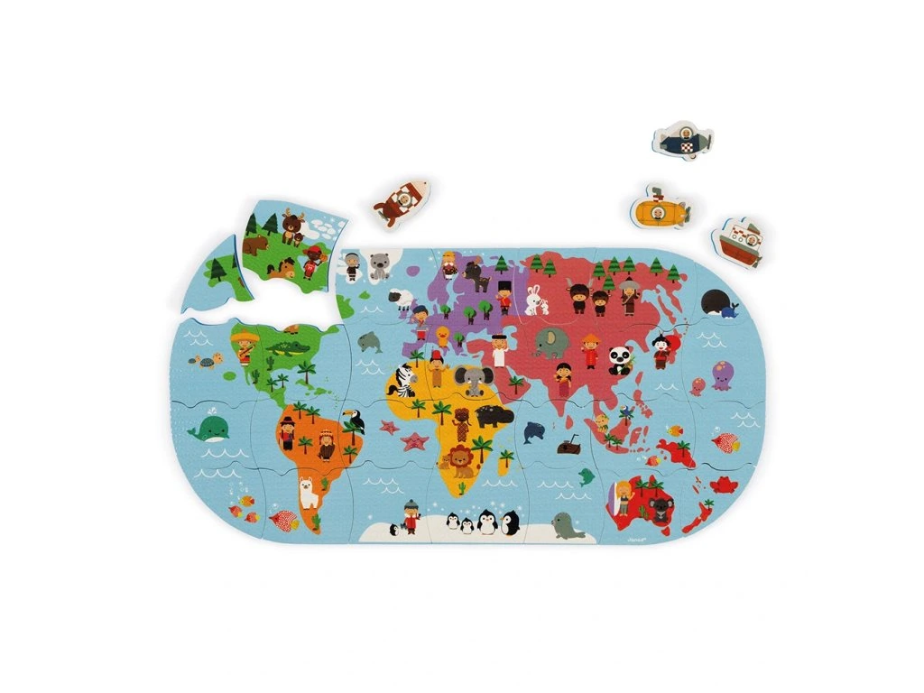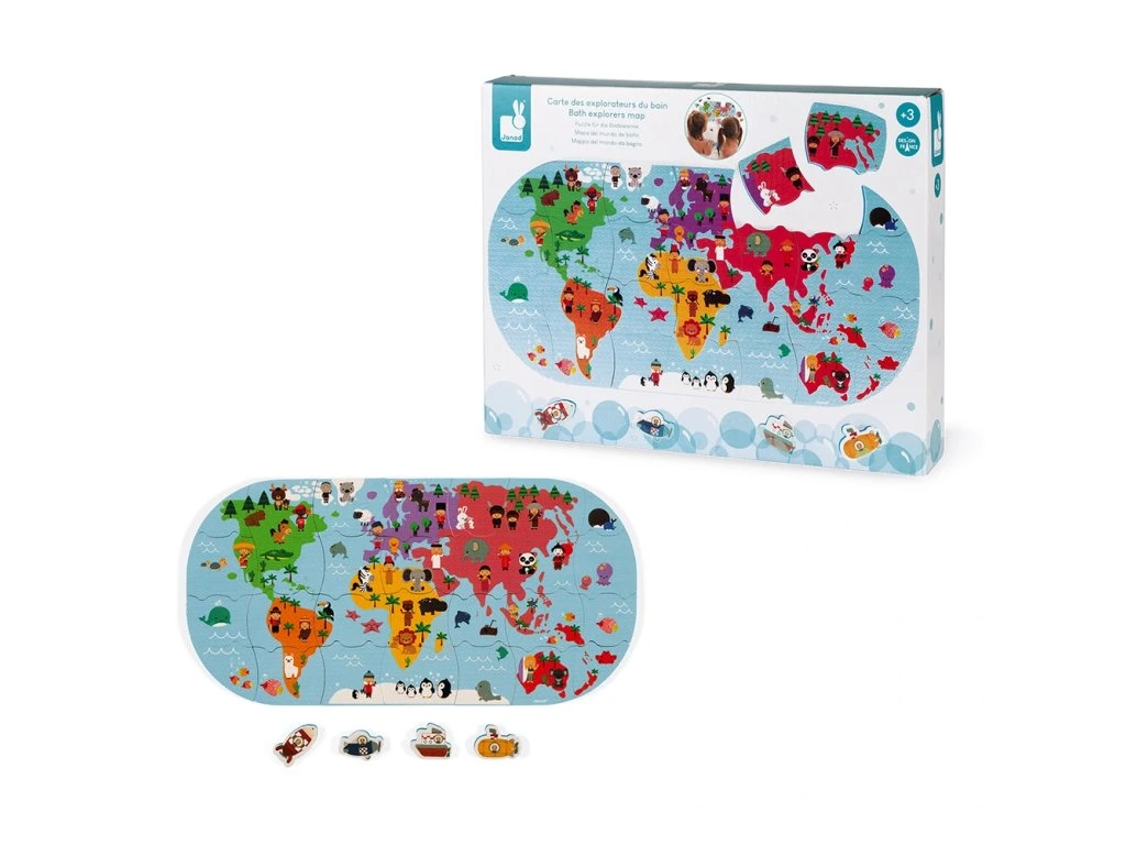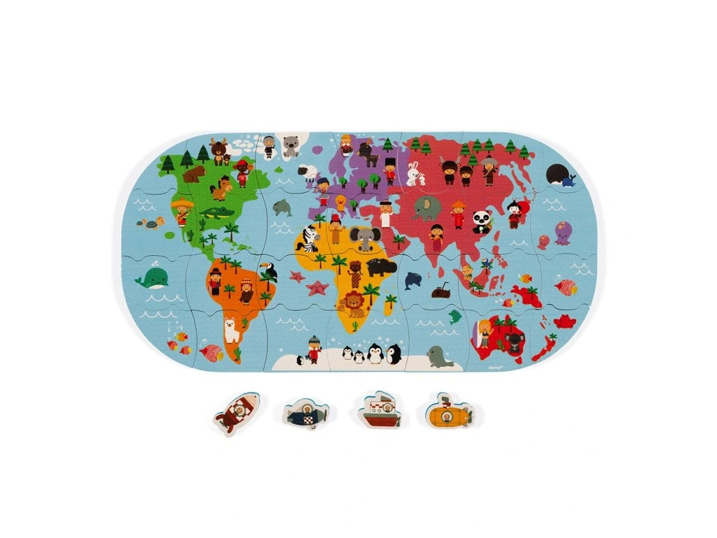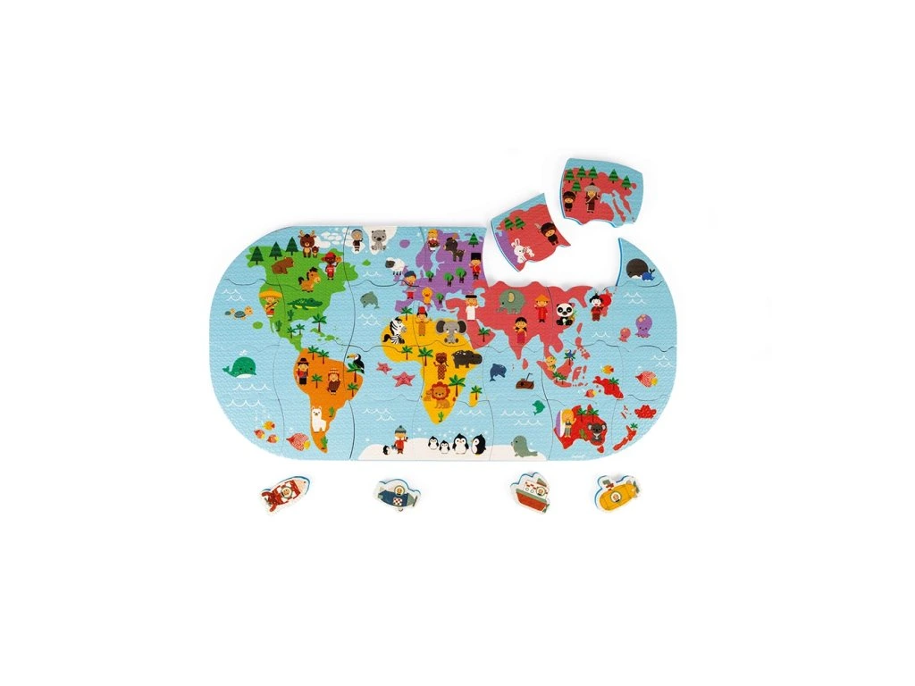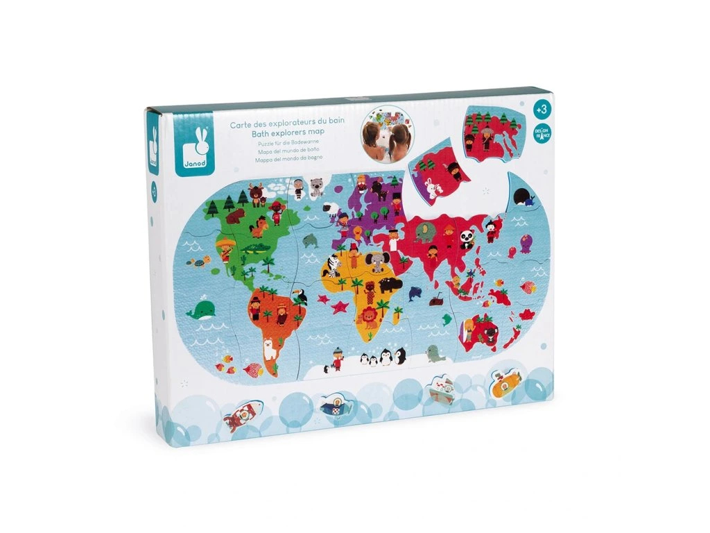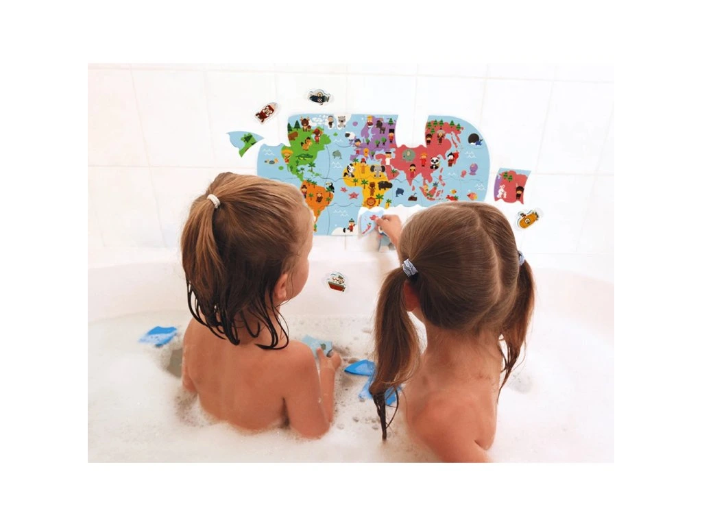 Měkké plastové puzzle Mapa světa vhodné na hru na suchu i ve vodě pro děti od 3 let. Balení obsahuje 28 dílků puzzle. Dílky puzzle plavou na vodě a přinesou mnoho zábavy při koupání. Je možné je přiložit a poskládat na kachličky.Vhodné pro děti: od 3 let