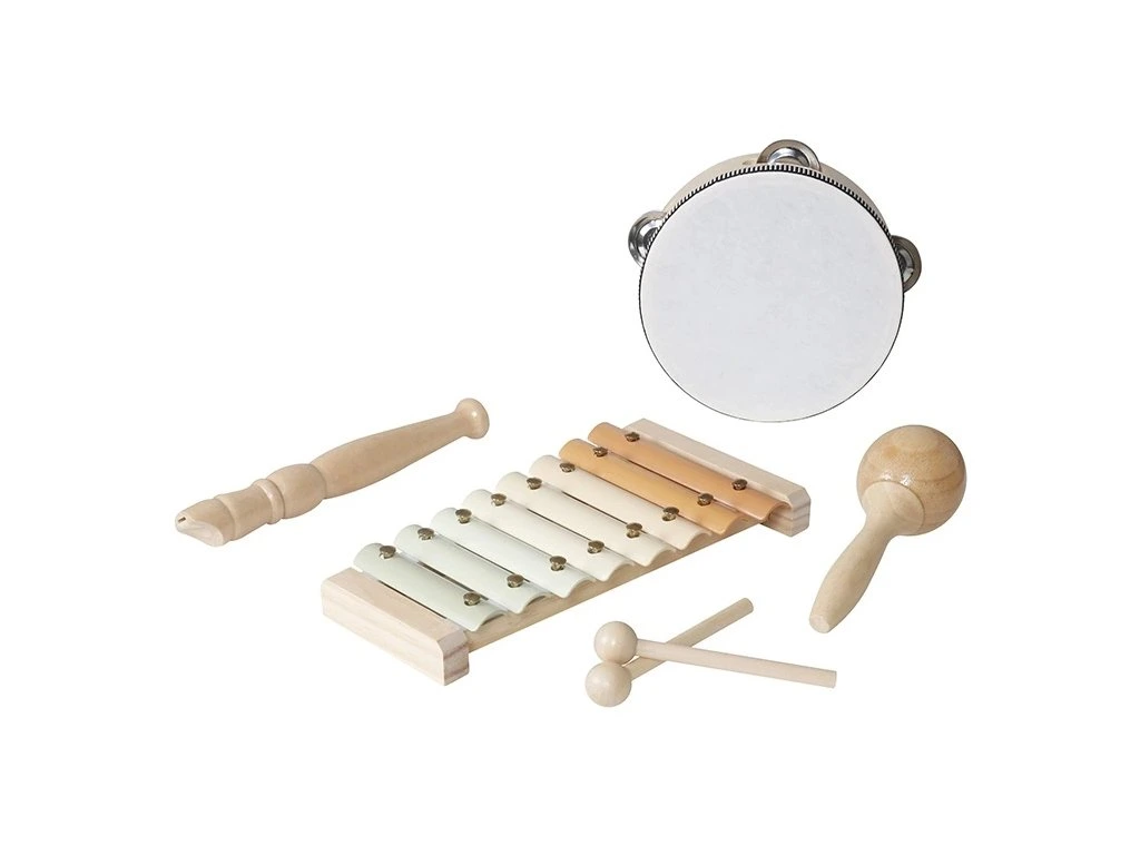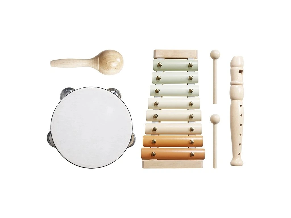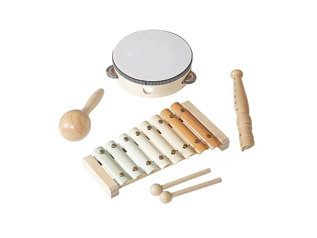 Sada obsahuje tamburínu, rumba kouli, flétnu a xylofon, díky čemuž nabízí pestrou škálu zvuků a jednoduchých melodií. Hračky jsou vyrobené z kvalitního přírodního dřeva doplněného jemnými pastelovými barvami.