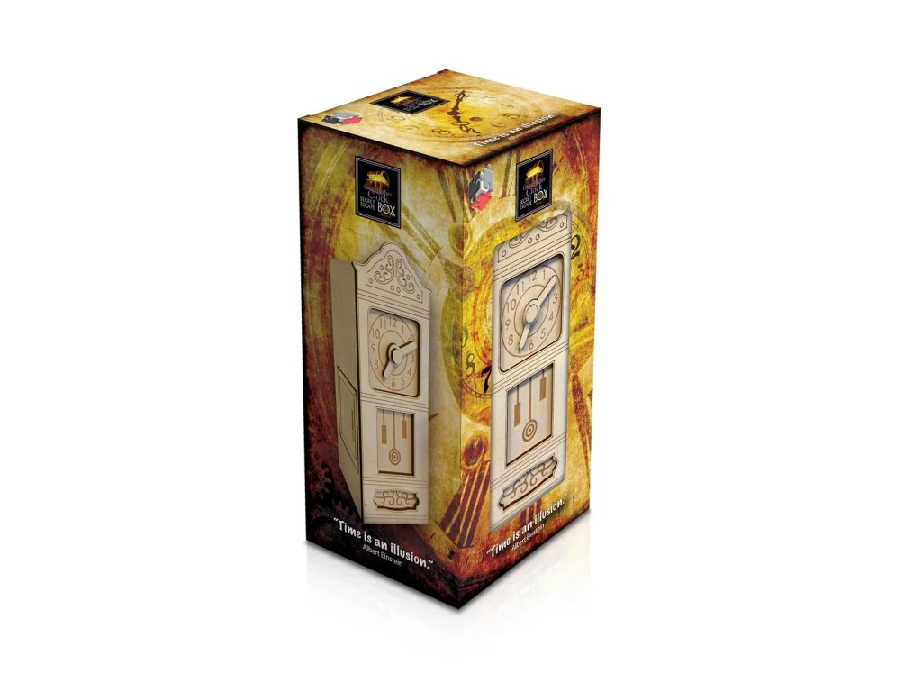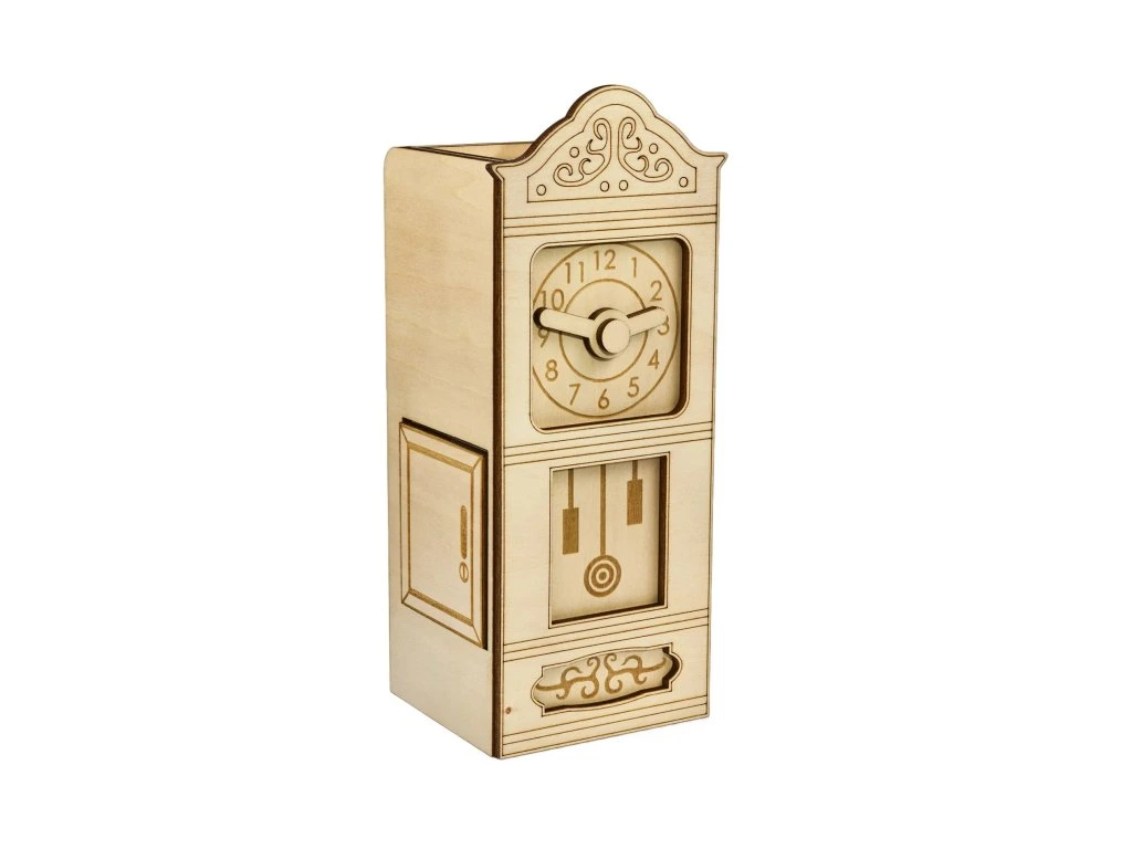Dřevěný hlavolamový box ve tvaru stojacích hodin se skrytou přihrádkou, určený na ukrytí drobných cenností. Hlavolam je vhodný pro experty.