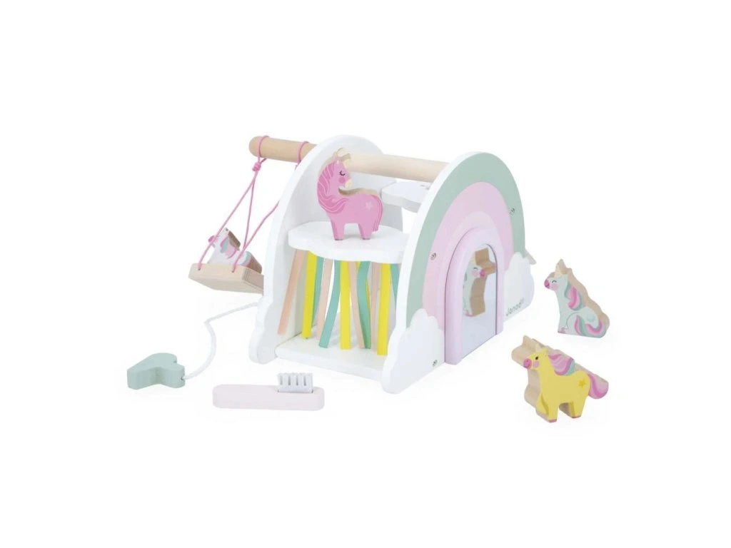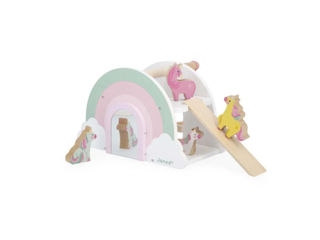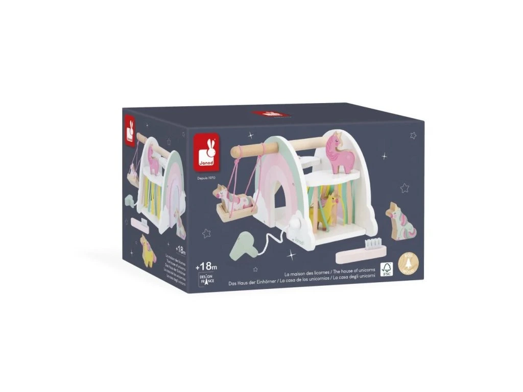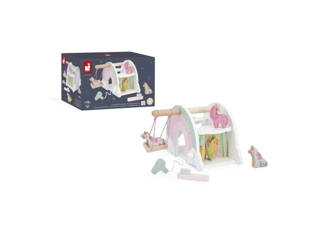Vstupte do okouzlujícího domu jednorožců! Hrajte si se 4 jednorožci a jejich skluzavkou, objevujte houpačku a tajná překvapení. Vhodné pro děti od 18 měsíců.