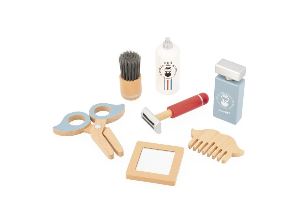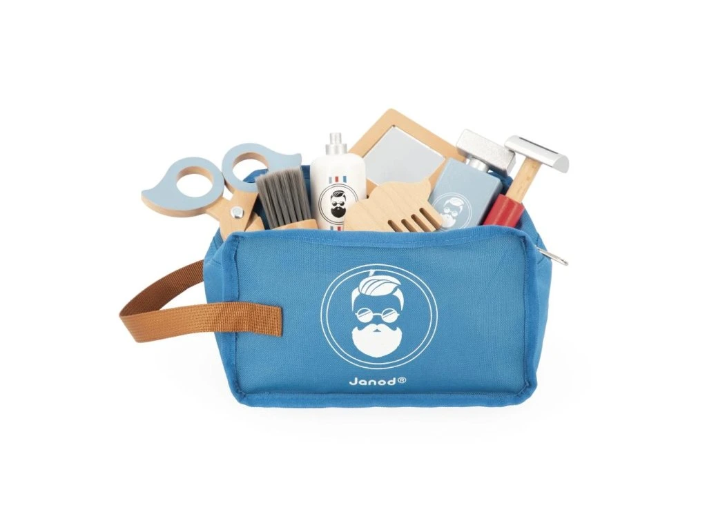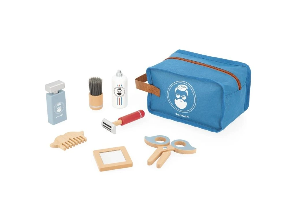 Kosmetický kufřík, díky kterému si vaše dítě bude moci hrát na malého tatínka! Vše potřebné na oholení a pěkný vzhled! Balení obsahuje 7 dřevěných doplňků: štětku na holení a pěnu na holení na obličej, holicí strojek, hřeben na vlasy, nůžky na konečnou úpravu, zrcátko na obdivování a kolínskou na konečnou úpravu!Dřevěná rolová hračka pro děti od 3 let.