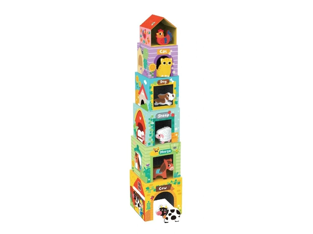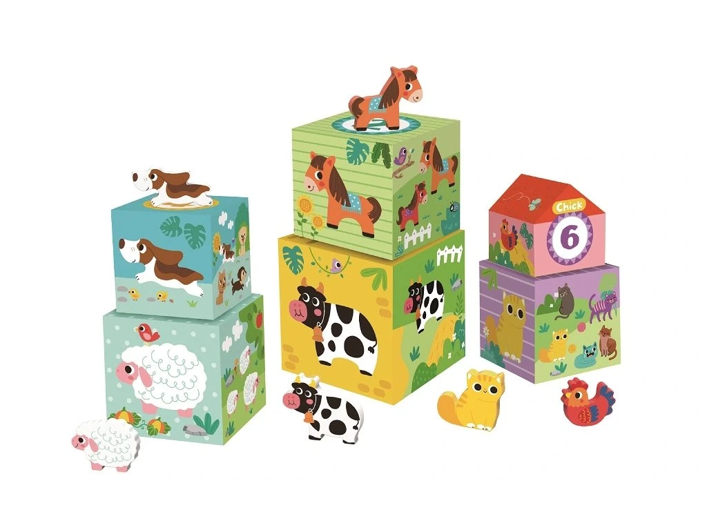 Těchto šest kostek není jen skládačka, ale i malé domečky pro farmářské kamarády. Každé zvířátko má svůj vlastní prostor a bezpečné místečko, takže si děti mohou vytvářet jednoduché i bohaté příběhy z farmy.
