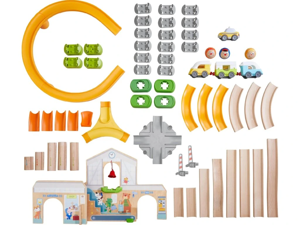 Barevná tobogán umožňuje dětem sestavit různorodé dráhy, které jsou obohacené o mostíky, lopatkové kola a zásobníky s pružinou umístěné na začátku a konci dráhy, což zajišťuje...