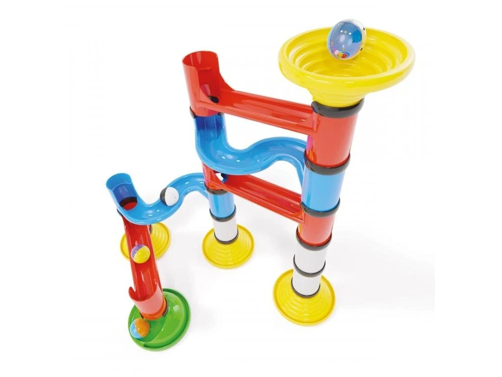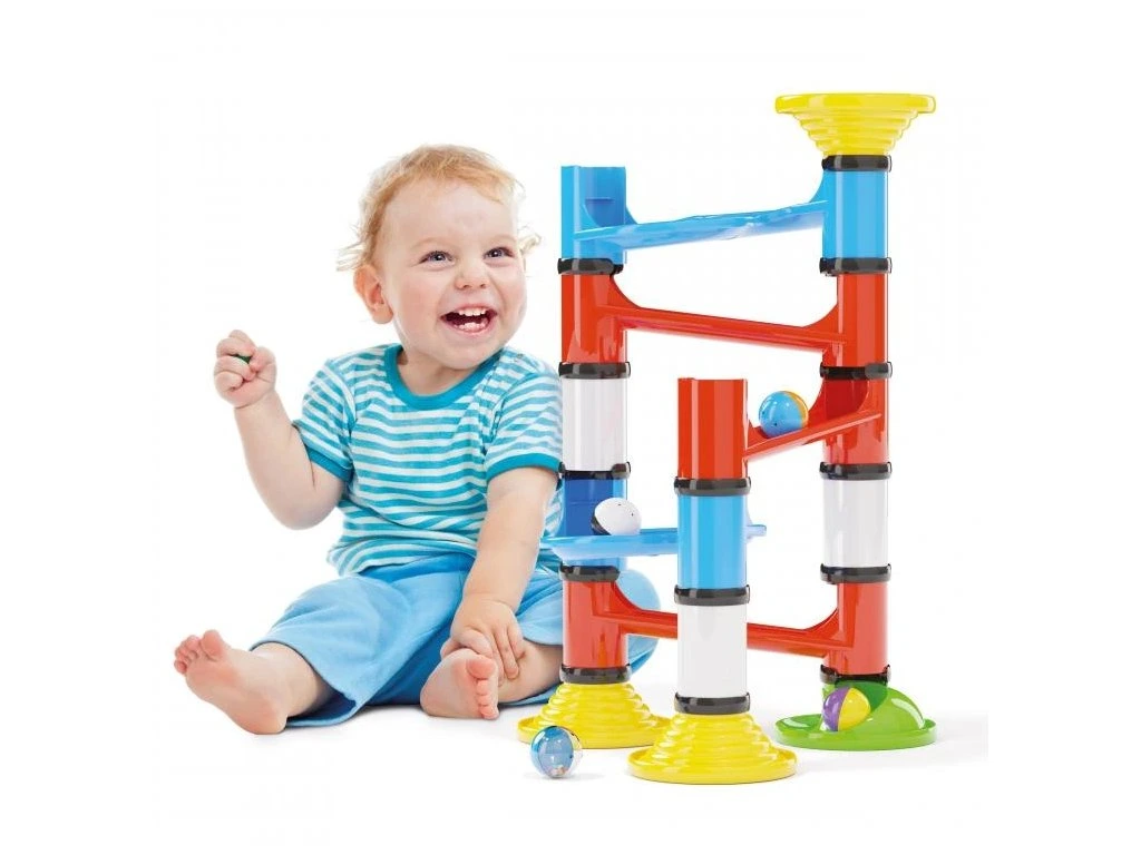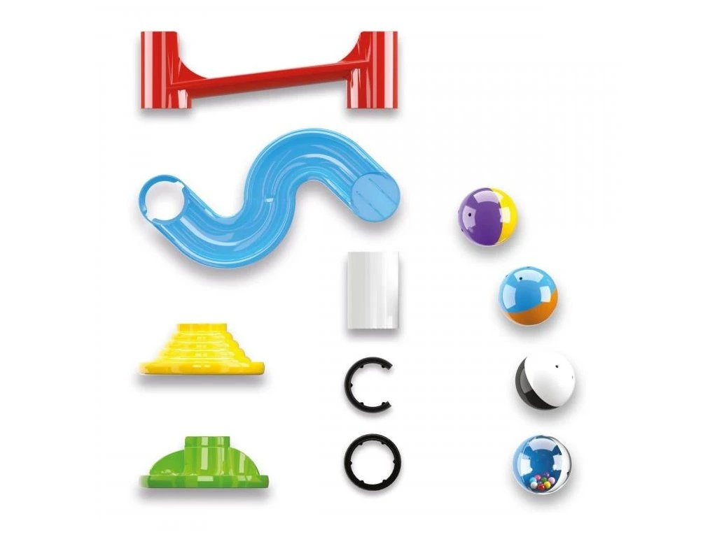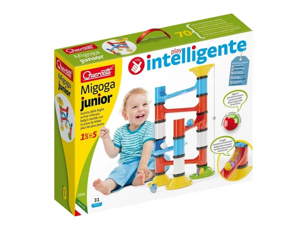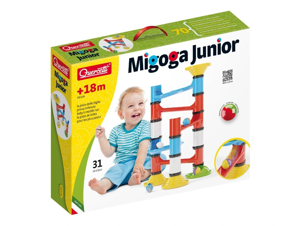 Stavebnice Migoga Junior je navržena speciálně pro menší děti, aby si mohly užívat hru s kuličkovou dráhou bezpečně a snadno. Velké, barevné díly umožňují jednoduché skládání a snadné rozpoznávání. Intuitivní spojení dávají dětem možnost rychle a jednoduše postavit různé dráhy, které podporují jejich kreativitu a schopnost řešit problémy.Kuličky s průměrem 4,5 cm, z nichž některé při pohybu chrastí, jsou navrženy tak, aby se kutálely pomalu, čímž děti déle sledují jejich pohyb a učí se nové věci. Tato stavebnice zajišťuje hodiny bezpečné hry, protože splňuje všechny bezpečnostní standardy a je vyrobena z materiálů nejvyšší kvality.