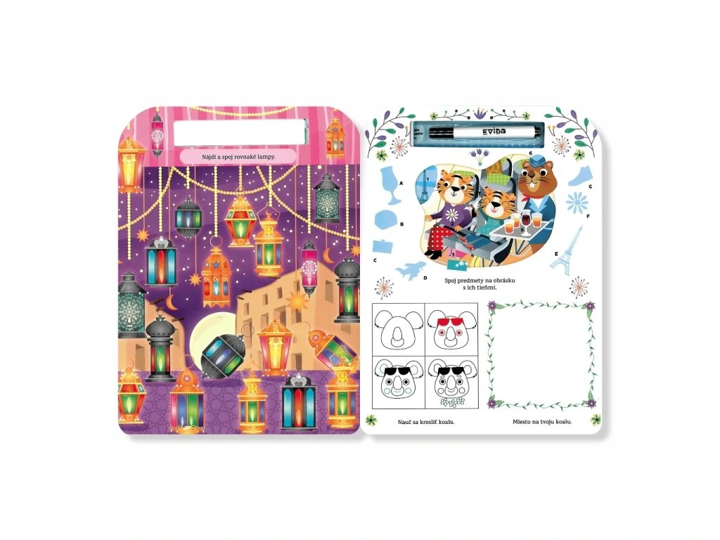 Kvídov sešit Cestovní aktivity- Cestování obsahuje úlohy zaměřené na hledání rozdílů, vyplňování křížovek a sudoku, procházení bludišti, počítání obrázků a řešení logických úloh. Pomáhá rozvíjet logiku, soustředěnost, představivost a jemnou motoriku. K sešitu přísluší také smazatelná fixka, která se dá z laminátových stran lehce vymazat pomocí papírového ubrousku.Balení obsahuje: 22 stránek plných zajímavých aktivit a smazatelnou fixku.