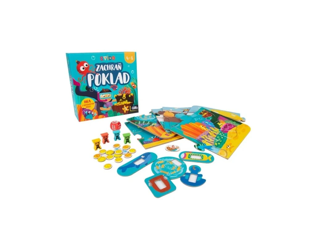 Hra obsahuje: 4 dřevěné figurky potápěčů, figurku pirátů, dřevěnou hrací kostku, 16 žetonů s poklady, kartonovou hrací desku a pravidla.