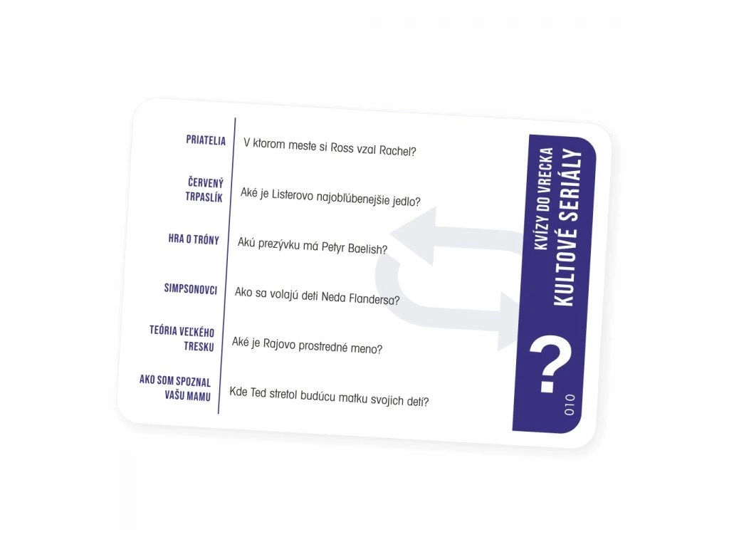 Poutavý zábavný kvíz, se kterým si připomenete slavné seriály a jejich protagonisty. Hra je díky svému provedení vhodná i na cesty – stačí si ji vzít do kapsy a můžete začít hrát kdekoliv.Ve hře najdete 300 otázek rozdělených do 6 seriálů: Přátelé, Červený trpaslík, Hra o trůny, Simpsonovi, Teorie velkého třesku a Jak jsem poznal vaši matku.