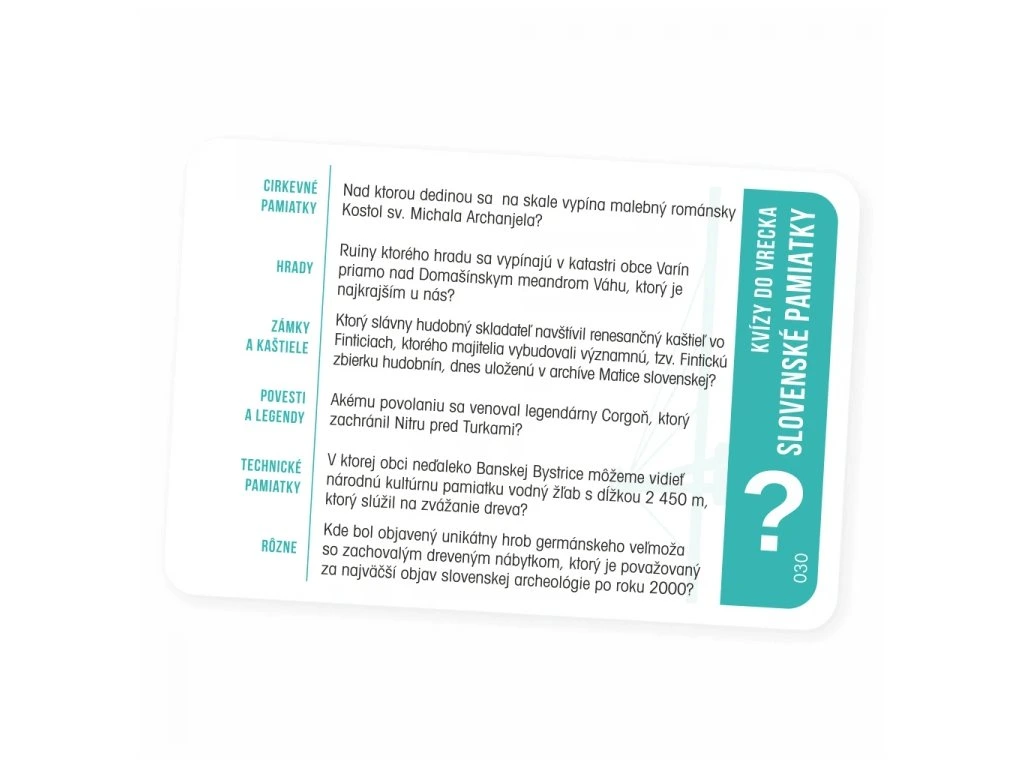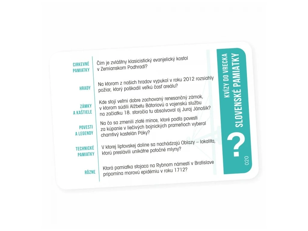 Poutavý zábavný kvíz o Slovenských památkách. Hra je díky svému provedení vhodná i na cesty – stačí vzít do kapsy a můžete začít hrát kdekoliv. Víno můžete hrát samostatně, ale kartičky mohou být také pro zpestření použity v základních verzích her Slovensko, Svět a Evropa – otázky a odpovědi.