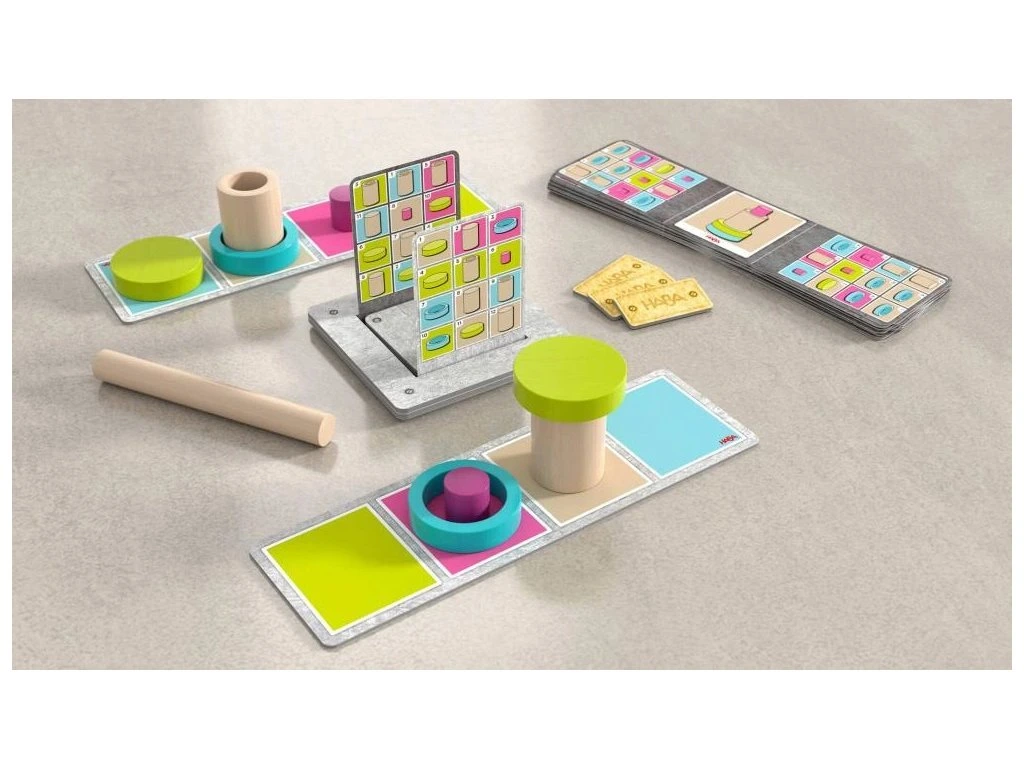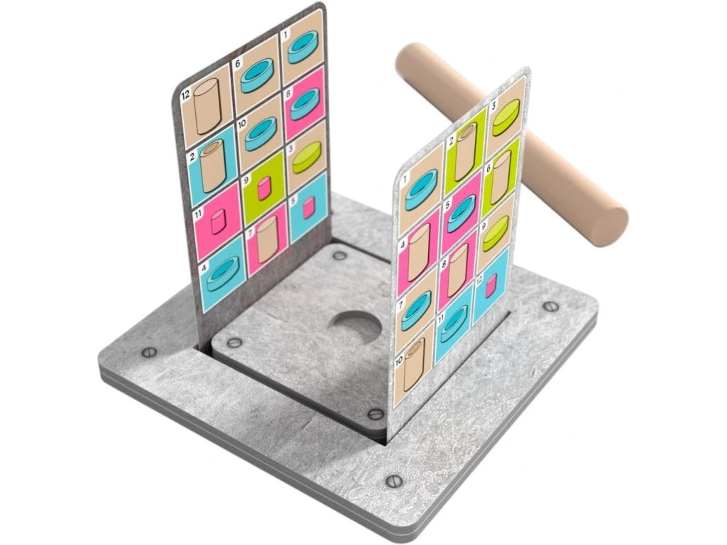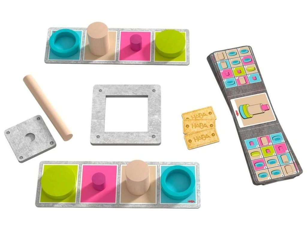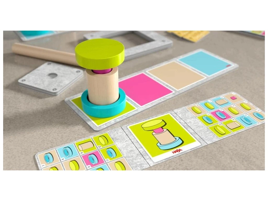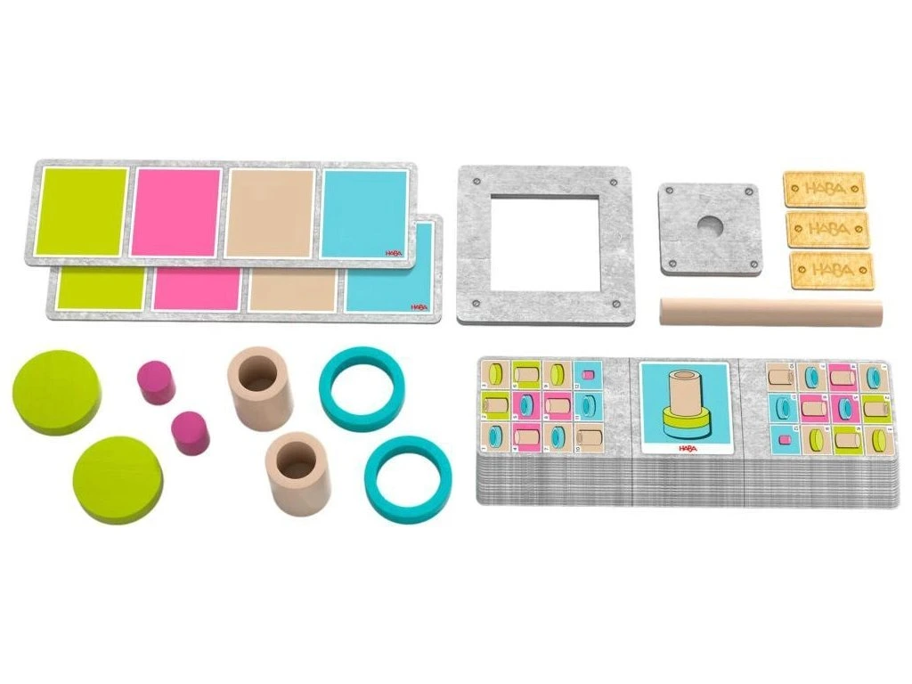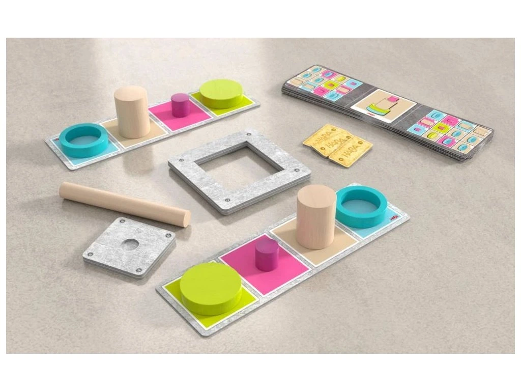 - 8 komponentů (2 zelené kotouče, růžový válec, hnědý sud a modrý kroužek)