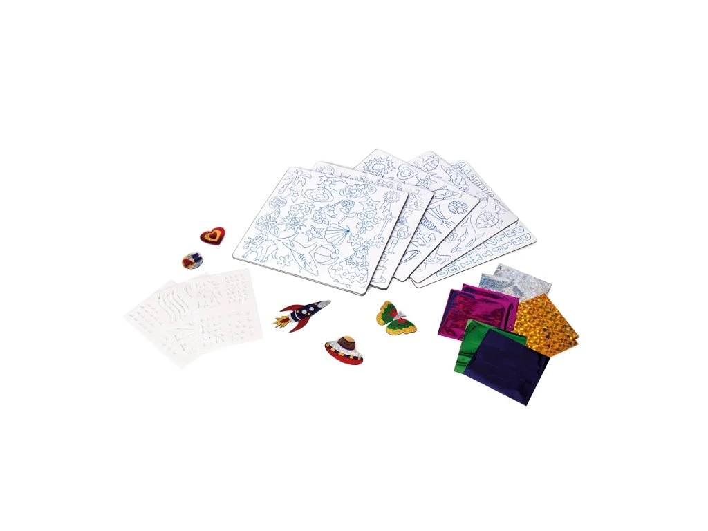 Souprava na výrobu třpytivých samolepek. Vyrobte si barevné samolepky podle své fantazie. Díky konceptu hra-učení-zábava si děti snadno najdou cestu k zábavnému tvoření.Souprava obsahuje: 8 archů samolepek, 58 různých barevných fólií, 3 listy šablon, návod v českém a slovenském jazyce.