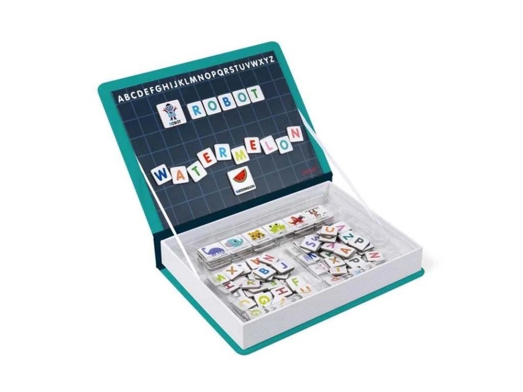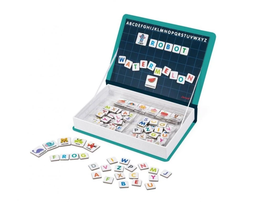 Praktické balení zajistí, že se hračka dá pohodlně přenášet, děti se s ní zabaví nejen doma, ale i na dlouhých cestách. Skládá se z 26 obrázkových magnetů a 104 písmenových magnetů.