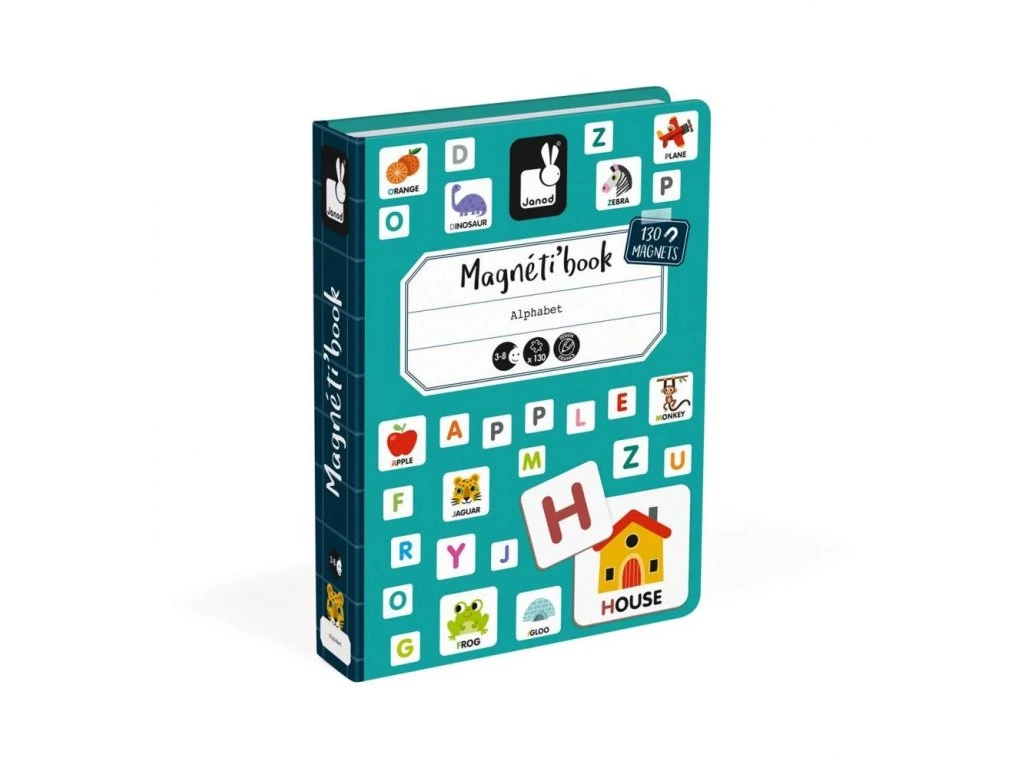 Magnetická kniha Magneti'Book English Alphabet je úžasná naučná hračka vhodná pro děti od 3 do 8 let. Skládačka s písmenky je plná barev, proto si s ní děti rády hrají a učí se nová písmenka a slovíčka. V předloze jsou různé předměty a zvířátka s obrázky a tištěnými písmeny. Menší děti na základě obrázku mohou říkat, co na obrázku vidí a rodič může název složit z písmenek česky i anglicky. Větší děti to už zvládnou samy. Mohou si vymyslet i vlastní slova nebo si dotvořit vlastní kartičky.Magnetická vzdělávací hračka obsahuje 26 kartiček s předlohami a 104 písmen.