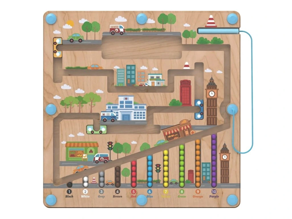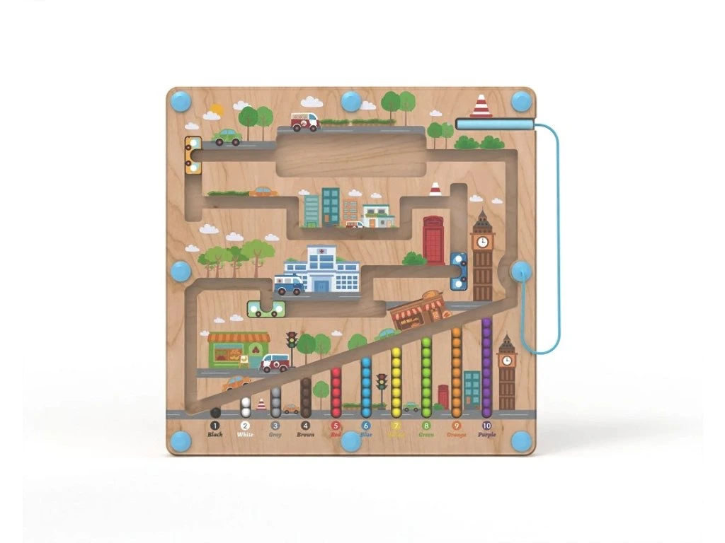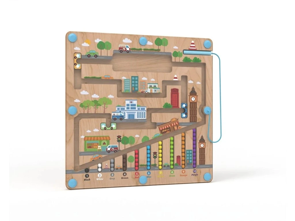 Dokážete převést všechny barevné kuličky přes městská zákoutí až do jejich cíle? Pomůžou vám při tom barevné autobusy a magnetické ukazovátko, které činí hru ještě zábavnější a zároveň procvičuje dětskou trpělivost a koordinaci ruky a oka.