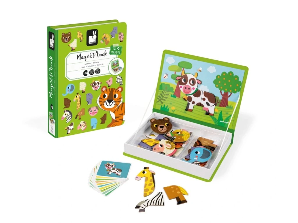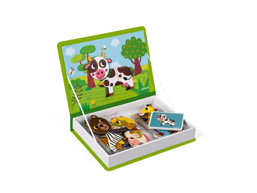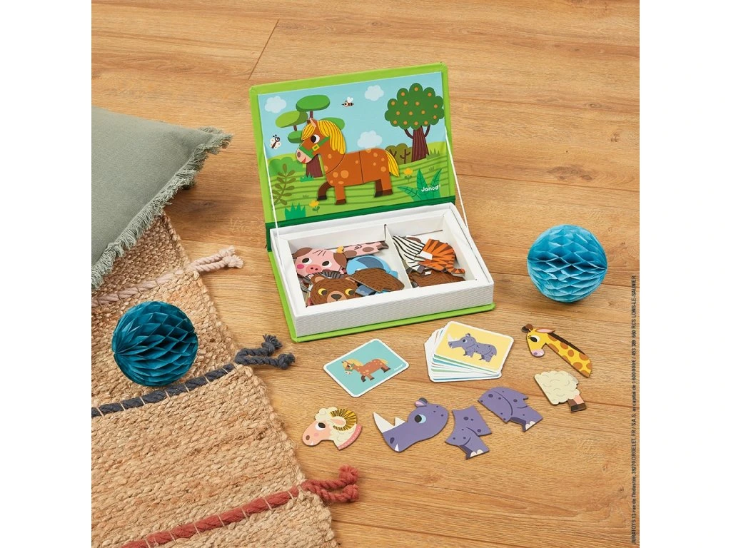 Znáte Magnetibok? Tyto přenosné a vzdělávací magnetické knihy zbožňují malí i velcí! Princip? Magnetická kniha obsahuje spoustu magnetických prvků, které můžete kombinovat podle předlohy nebo nechat promluvit svou kreativitu! Tato kartonová hra přenese děti od 3 let do krajiny velké fantazie díky 30 magnetům a 10 kartám předlohy. Uvnitř vám magnetická scéna umožňuje pomocí magnetů rekonstruovat obrázek z předlohové kartičky. Dítě se také bude moci bavit míšením různých kousků dohromady a vytvářet bláznivé postavičky, protože jsou všechny zaměnitelné! Umožňuje dítěti zlepšit představivost a jemnou motoriku. Tento produkt je vyroben z materiálů certifikovaných FSC® a kontrolovaných materiálů.Magnetická kniha Magneti'Book Animals je krásná hračka vhodná pro děti od 3 do 8 let. Magnetická skládačka ve tvaru knihy má pestrobarevný motiv, který děti zaujme. Pobavte vaše děti skládáním obrázků z magnetických dílků podle předlohy. Děti podle kartiček skládají zvířátka, která jsou rozdělena na více částí.