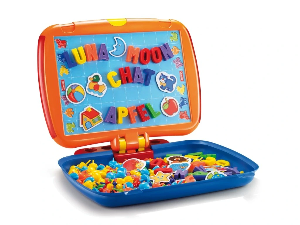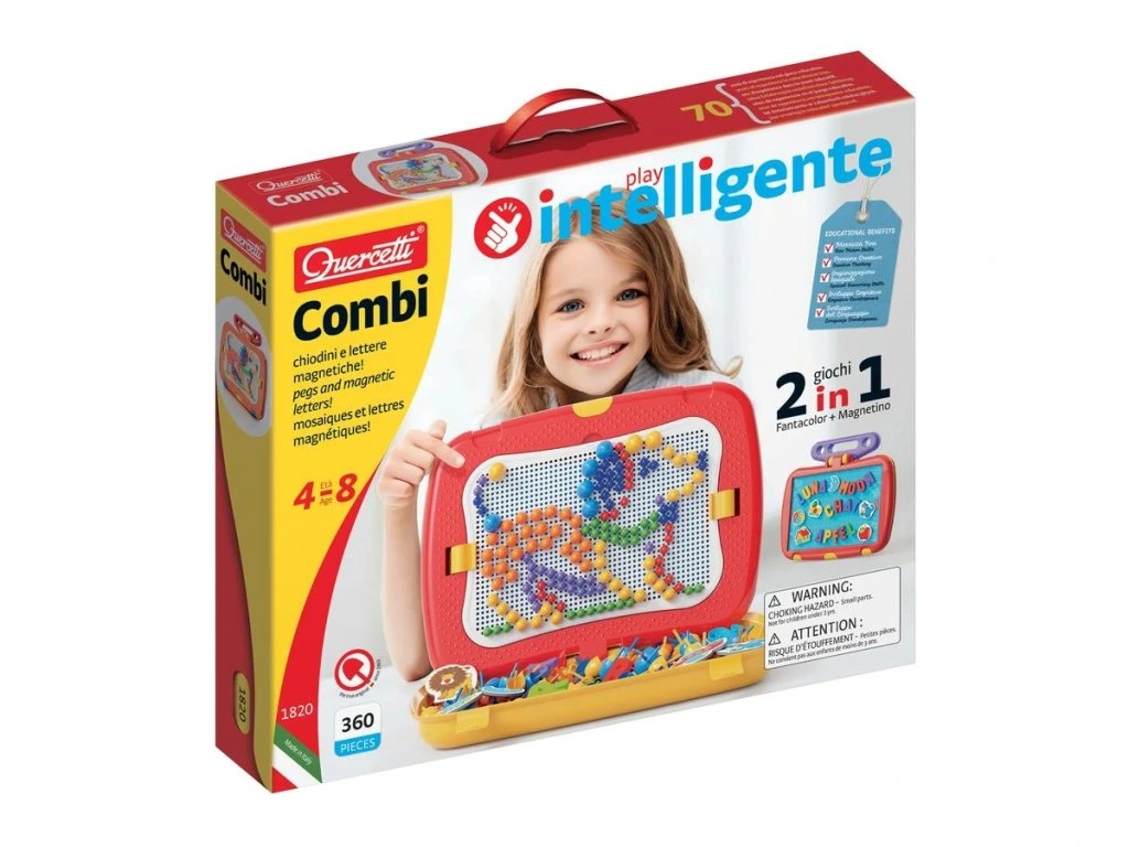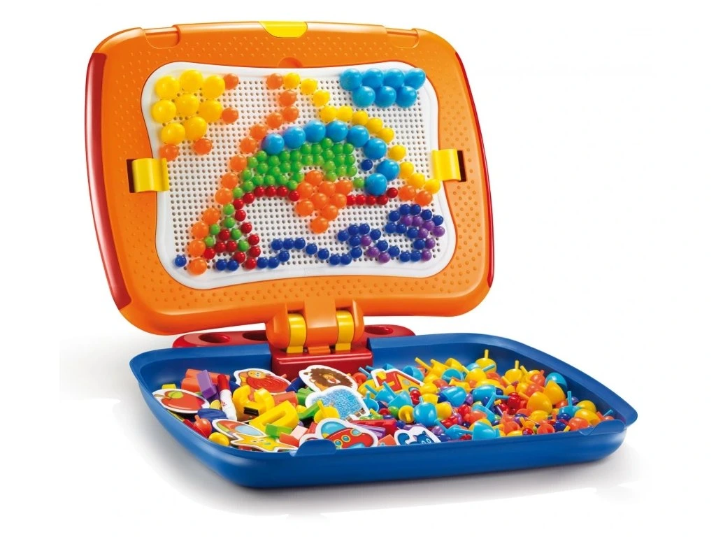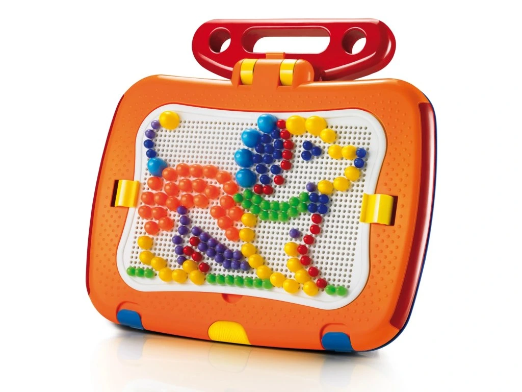 Tento unikátní kufřík kombinuje dva bestsellery v jedné praktické hře. Na jedné straně najdete děrovanou plochu mozaiky na 300 barevných kolíčků různých velikostí, které umožňují dětem tvořit různé vzory a obrázky. Na druhé straně je magnetická tabule na písmenka a obrázky, která podporuje učení a kreativní hraní.Kufřík je navržen bez ostrých hran, což zajišťuje bezpečné používání, a zároveň umožňuje jednoduché přenášení a rychlé sestavení hrací plochy. Tento praktický herní set nabízí dětem zábavu i vzdělávání kdekoliv a kdykoliv.
