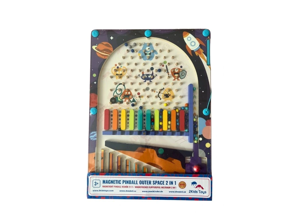 Originální dřevěná hra s vesmírným motivem nabízí dětem hned dvě možnosti, jak si užít spoustu zábavy: klasický pinball s vystřelováním kuliček a magnetickou hru se sbíráním bodů.
