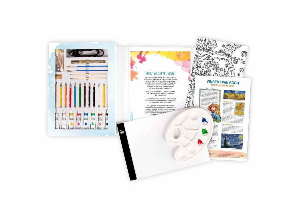 Sada obsahuje vše potřebné pro kreativní tvorbu – od štětců a barev až po obkreslovací svítící LED desku a pracovní sešit s návody a inspiracemi.
