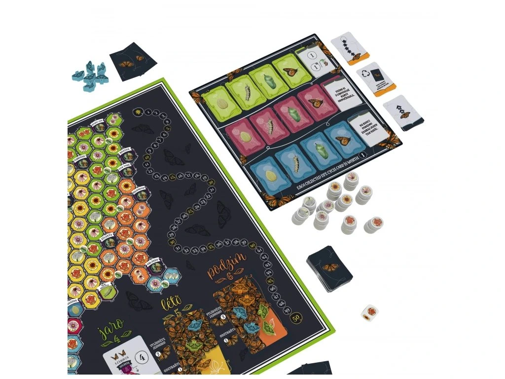 OBSAH HRY: květinovou kostku, 120 žetonů květů, 5 bodovacích žetonů (1 od každé barvy), 16 žetonů odpočívadel, desku odpočívadla, 60 karet životního cyklu, 36 karet pohybu, 6 žetonů životního cyklu, herní plán, 50 dřevěných žetonů motýlů (10 od každé barvy), 20 karet cílů ročních období (5 pro jaro, 10 pro léto, 5 pro podzim), 15 karet bonusového pohybu a pravidla v češtině a slovenštině.