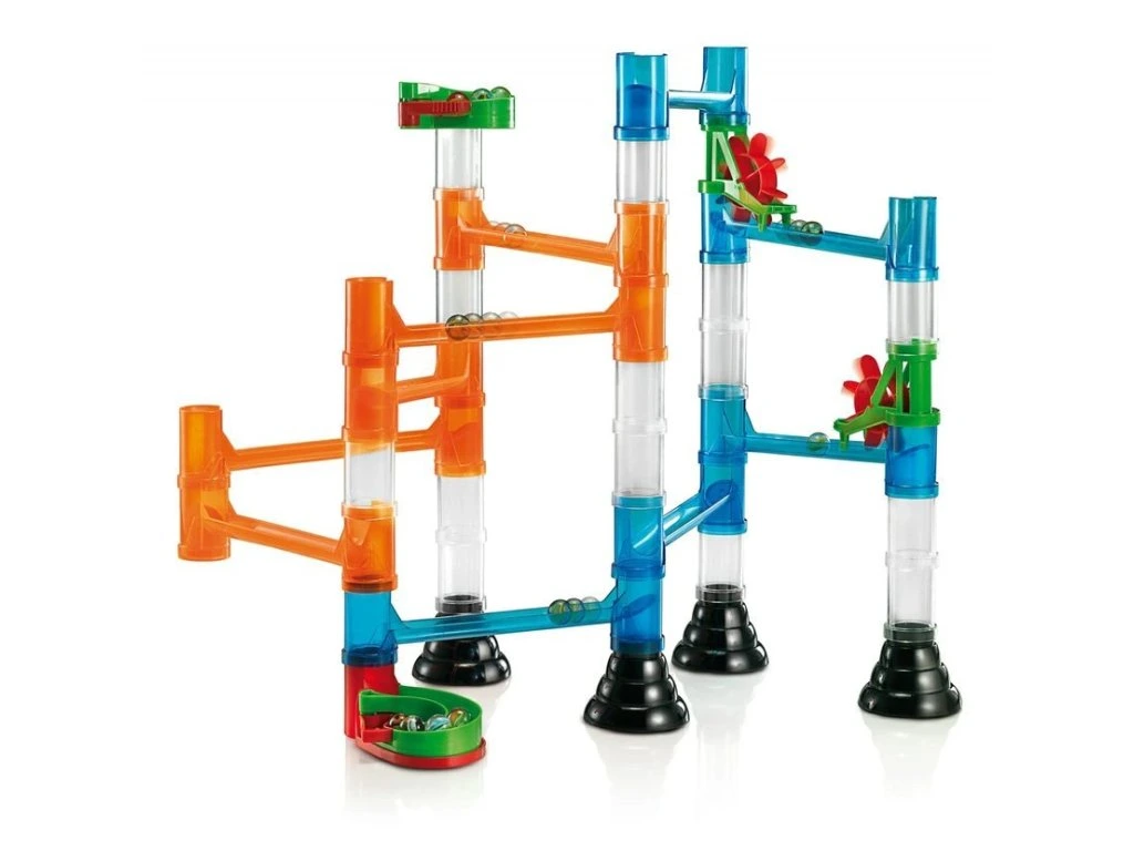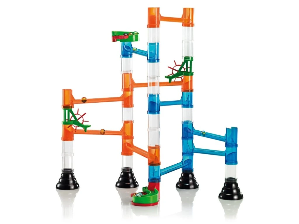 Vytvořte si díky naší skvělé stavebnici svou vlastní kuličkovou dráhu! Děti mohou sestavit modely vyobrazené na krabici nebo se pustit do tvorby vlastních návrhů. Vzájemně do sebe zapadající skluzavky, mostky, sloupky i lopatkové kola poskytují nekonečné možnosti kombinací a zaručují hodiny zábavy a objevování.