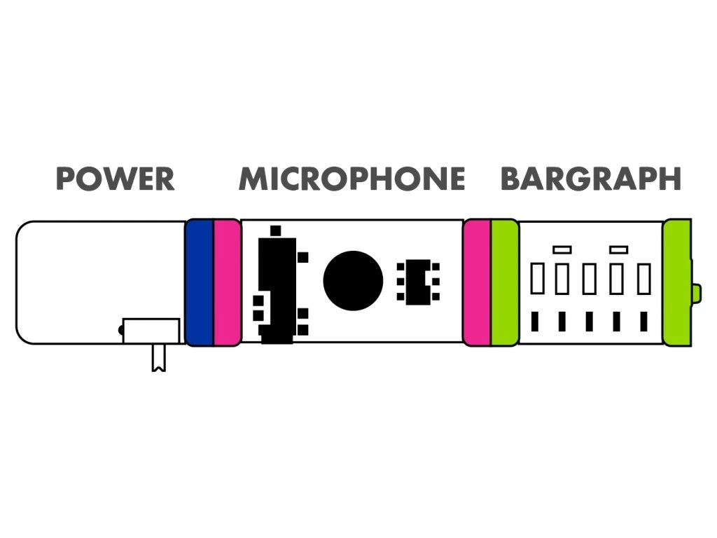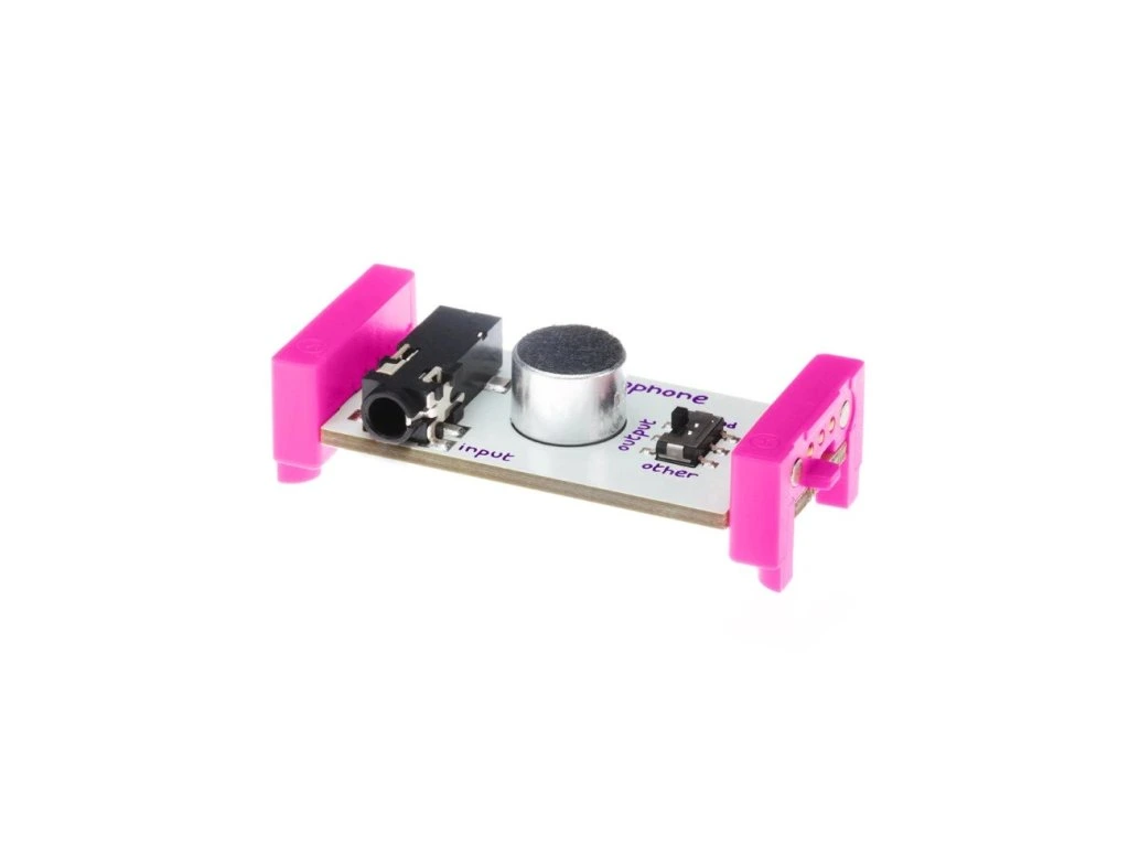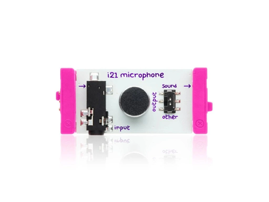 Mikrofon mění akustický signál na signál, kterému rozumějí tvoje prvky littleBits. Můžeš ho použít při změně zvuku na světlo nebo pohyb.