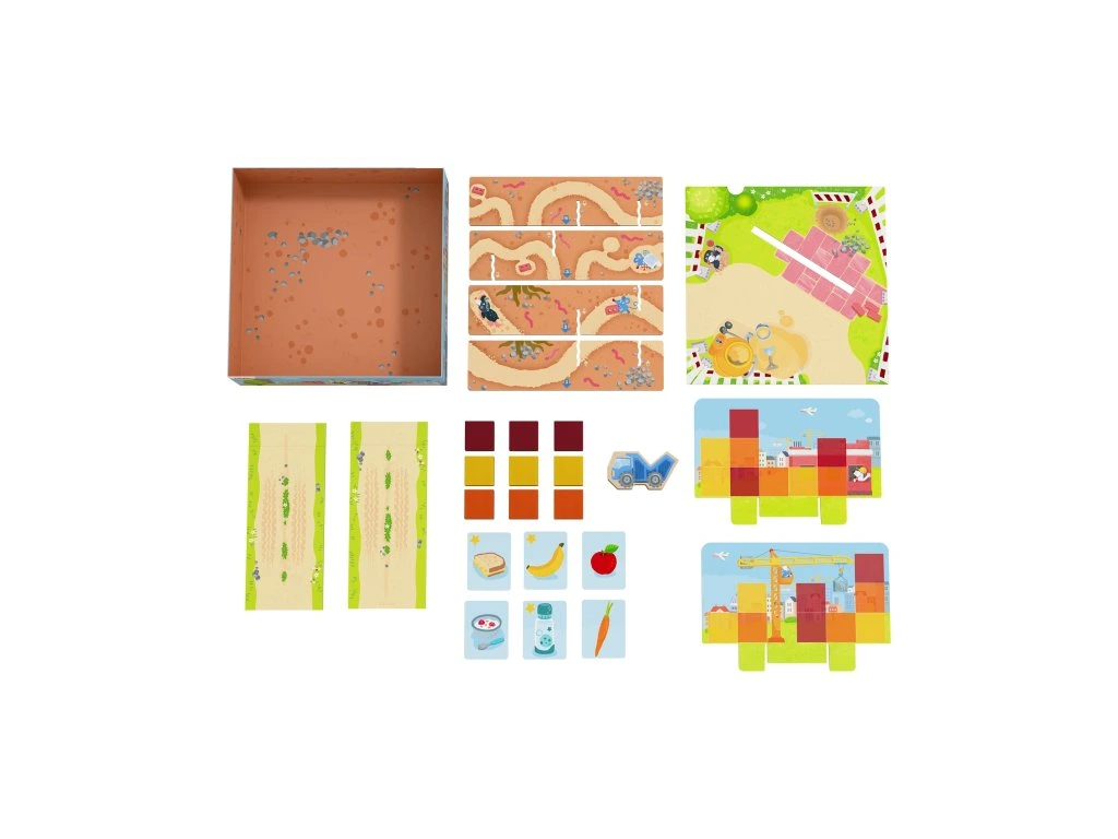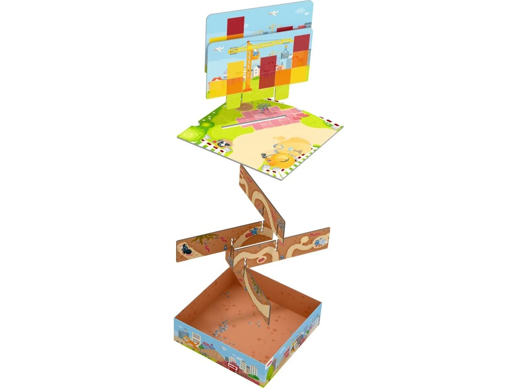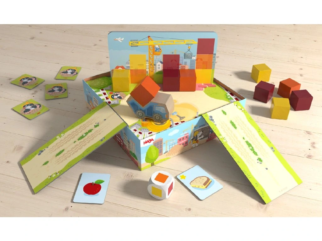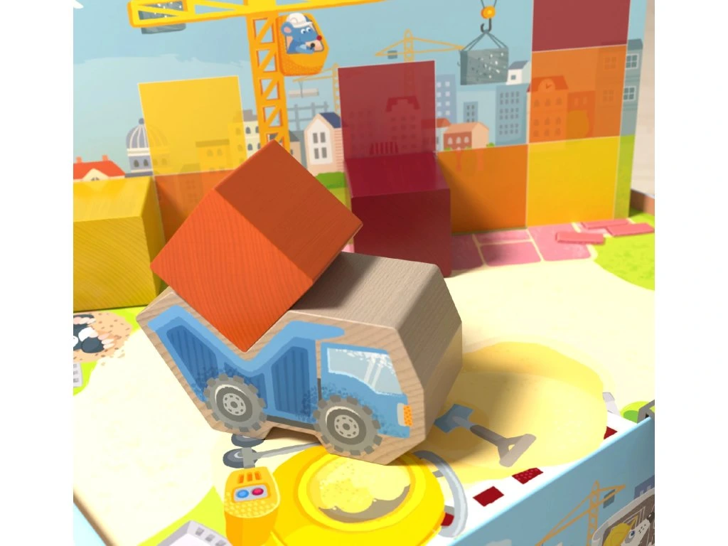 V domech Haba je rušno! Na každém kroku se staví. Patro po patru, kostka po kostce, vyrůstají nové domy. Vyhrnete si rukávy a pusťte se do práce! Děti používají nákladní auto na převoz potřebných stavebních kostek a jeřáb na jejich přesné umístění. Podaří se jim poskládat všechny kostky podle stavebního plánu dříve, než se pracovní den skončí?