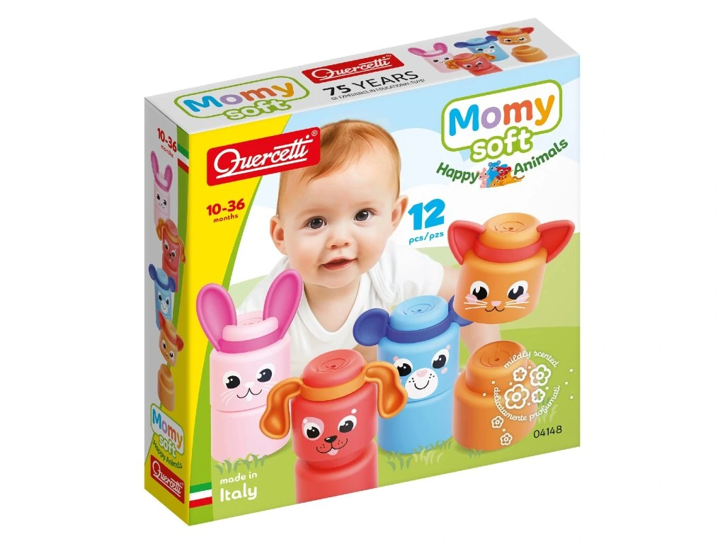 Momy Soft Happy Animals je okouzlující sada 12 měkkých, barevných prvků určených pro děti ve věku 10 až 36 měsíců. Děti si mohou postavit a kombinovat 4 roztomilé zvířecí postavičky, což podporuje kreativitu, jemnou motoriku a koordinaci oko-ruka. Kostky jsou vyrobené z bezpečných, měkkých materiálů se zaoblenými tvary a živými barvami, snadno se uchopují a stohují, což je ideální pro rané smyslové objevování.