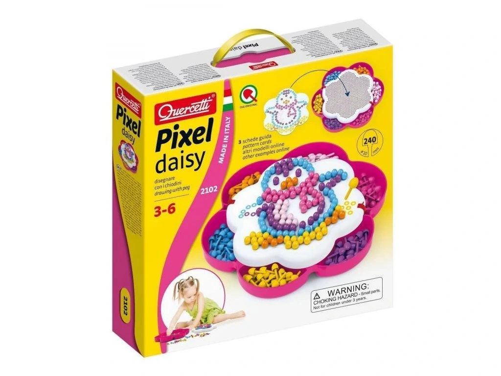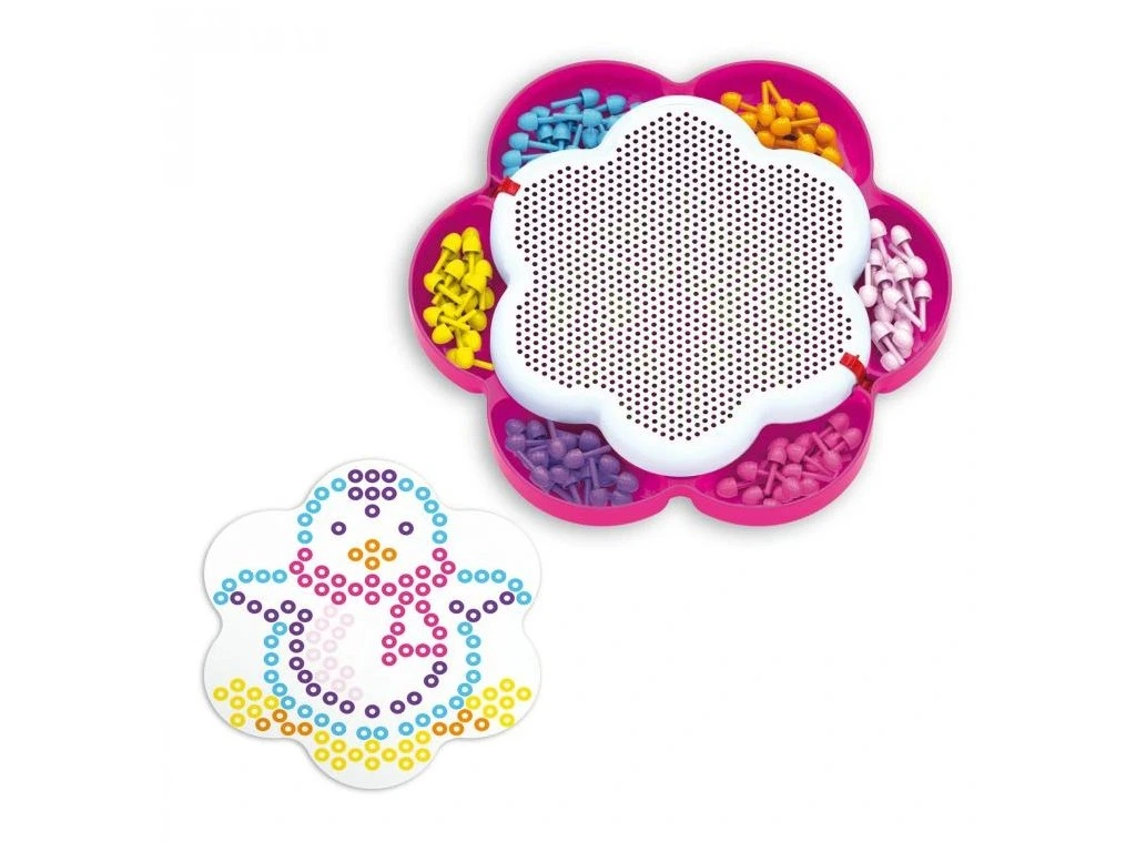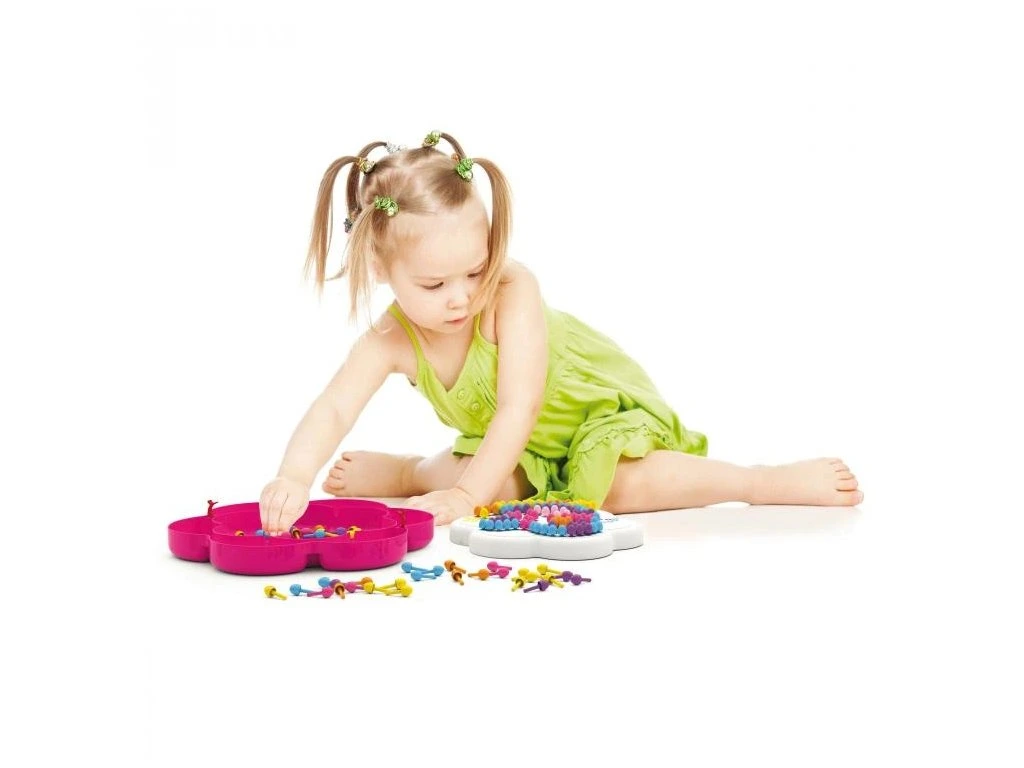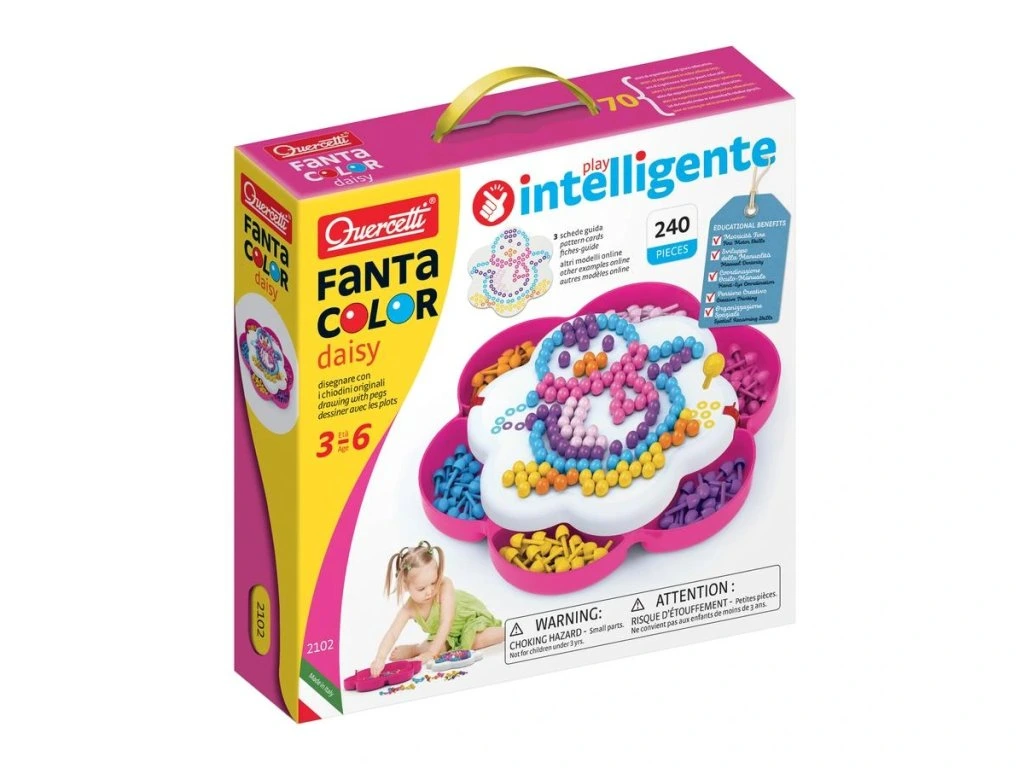 Mozaika FantaColor Daisy je kreativní hračka, která umožňuje dětem vytvářet mnohobarevné obrázky pomocí kolíčků. Velká hrací deska ve tvaru sedmikrásky a praktická schránka s přihrádkami na kolíčky zajišťují přehlednost a jednoduché uskladnění. Díky přihrádkám si děti mohou roztřídit kolíčky podle barev, aby měly vždy po ruce ten správný.Součástí balení jsou tři předlohy, které poskytují inspiraci na skládání obrázků, a několik dalších předloh je dostupných zdarma ke stažení. Tato mozaika nabízí dlouhé hodiny zábavy, uvolňuje mysl, zlepšuje koncentraci a stimuluje vnímání barev u dětí.