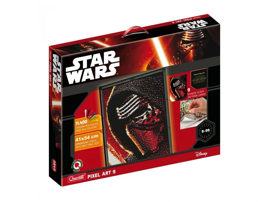 Pixel Art od Quercetti nabízí dětem i dospělým možnost vytvářet úžasné portréty hrdinů ze světa Star Wars pomocí slavných kolíčků této značky. Stačí si vystřihnout vzorové karty, rozložit je na perforované základní desky a vložit kolíčky – a pak se začne magický proces. Kolíčky, ačkoli jsou jen v šesti barvách, vytvářejí při pohledu ze správné vzdálenosti iluzi tisíců nových barev a odstínů, jako by šlo o skutečnou fotografii. Pixel Art je prvním produktem ve světě hraček, který využívá optické míchání barev, podobně jako pointilismus z konce 19. století. Místo olejových barev se používají kolíčky, ale výsledek je stejně působivý.Souprava obsahuje 9 základních desek a jeden rámeček, který umožňuje složený obraz vystavit a zavěsit na stěnu. Výrobky Pixel Art splňují vysoké standardy kvality a bezpečnosti a zaručeně ozdobí váš domov.