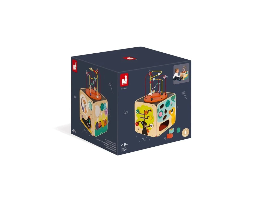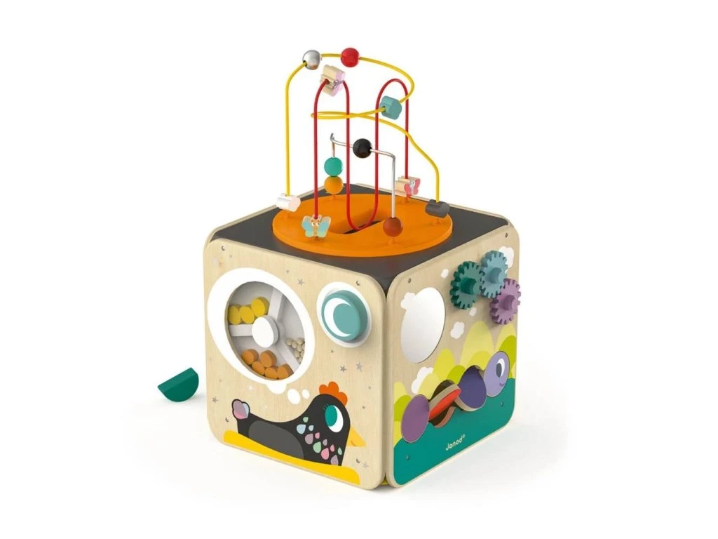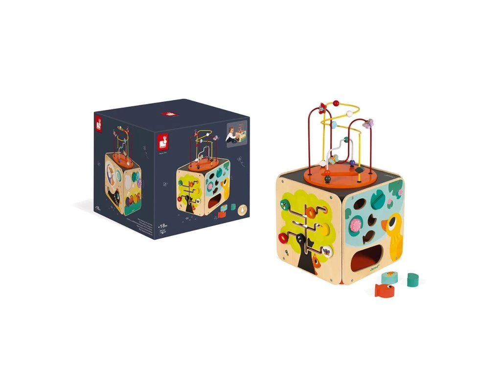 Pestrobarevná dřevěná multifunkční kostka MultiActivity Janod se smyčkovým labyrintem a dalšími 8 vzdělávacími aktivitami k tomu. Když otočíte kolečkem mlýnku můžete pozorovat jak se přesypávají vajíčka různých velikostí a jaký zvuk vydávají.Otáčejte ozubenými kolečky, otočte bříška housenky a změníte tak její barvu, nebo pozorujte svou tvář v zrcadle.Vkládejte do jezírka rybky, zvířátka a květinky (5ks tvarů). Pojmenujte vybrané druhy ovoce a hmyzu a posouvejte jednotlivými dřevěnými dílky po větvičkách stromu. Vrchní část kostky je smyčkový labyrint, který se dá vybrat a po hraní vložit zpět do vnitřku.Hračka vhodná: od 1 roku