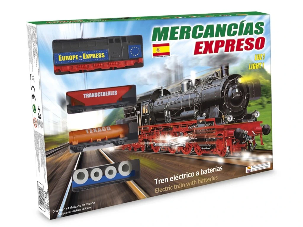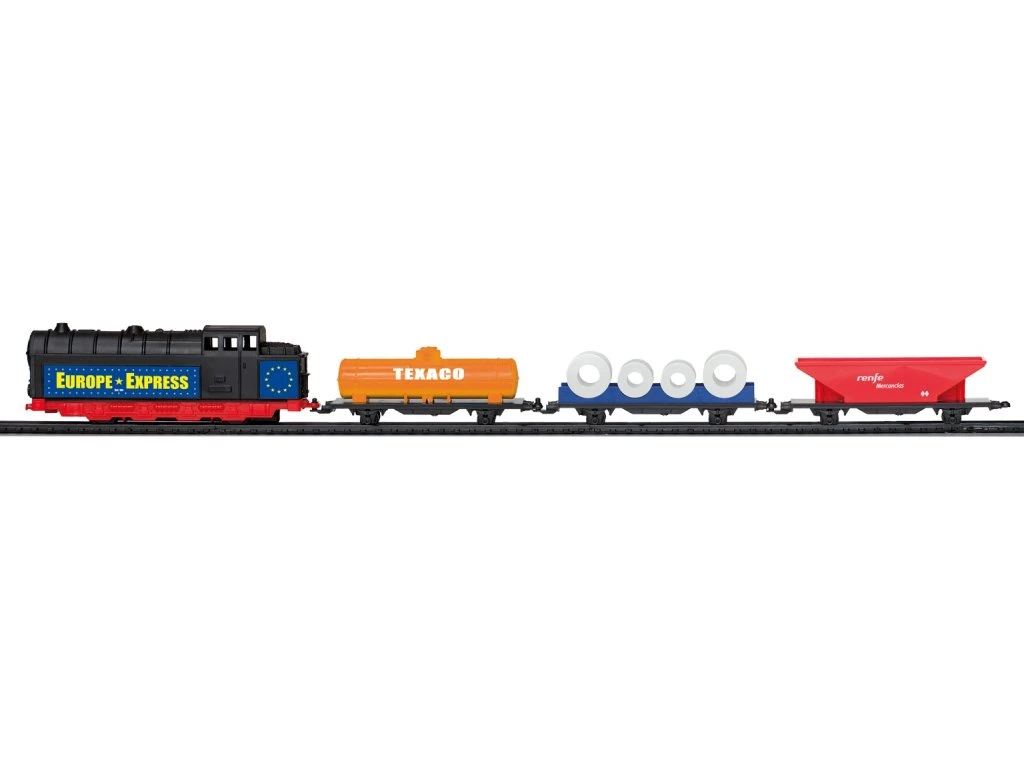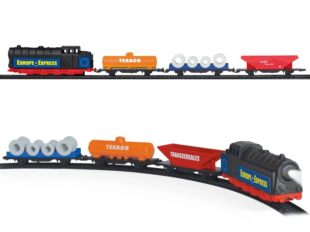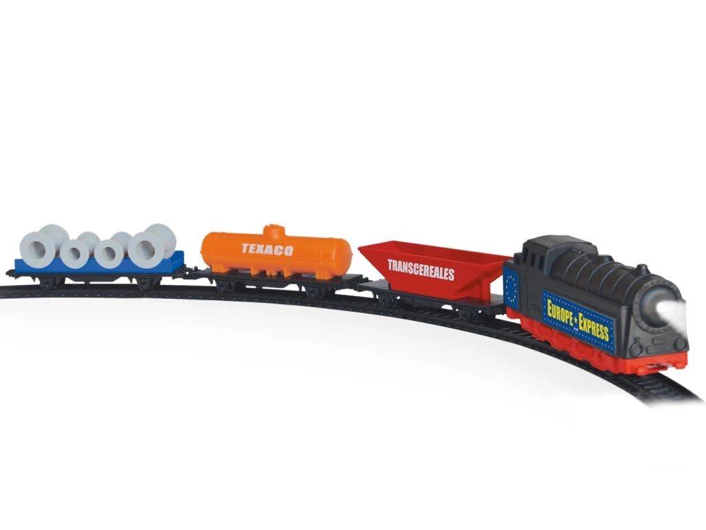 Nákladní vlak na baterie se světlem a se 3 druhy nákladních vagónů, který jezdí po trati dlouhé 2,94 m. Tento set přináší dětem zábavu a zároveň rozvíjí jejich představivost a koordinaci při hraní s vlakovou soupravou.